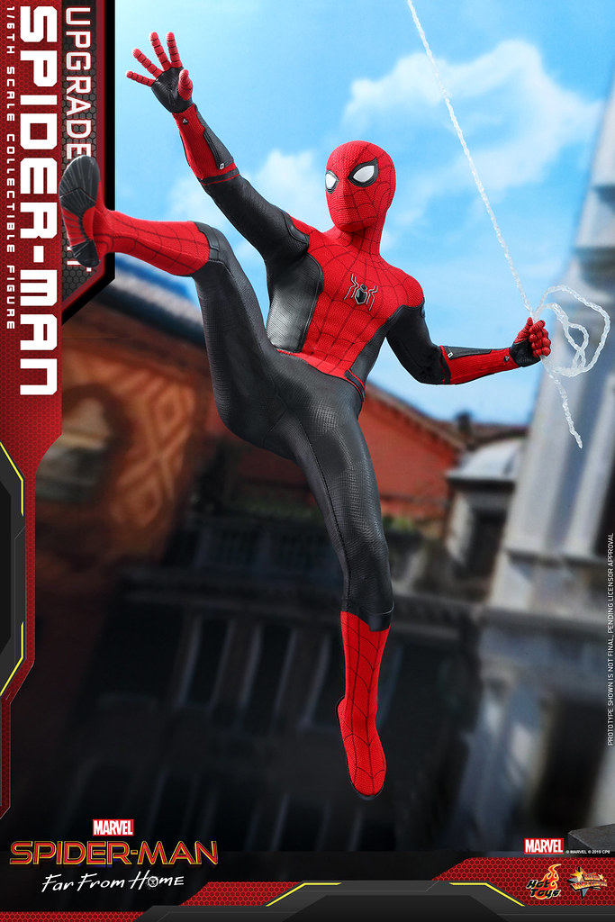 「蜘蛛人 (升級版戰衣) 1/6 比例人偶」高約28.5 公分,全身共計30 處可動,選用具備彈性的高質感布料縫製出這套即將登上大銀幕的紅、黑配色新戰衣,再現了胸口的蜘蛛標誌、網狀線條,與戰衣表面的顆粒紋理,還附屬了可模擬蜘蛛人在空中滑翔、以磁吸方式固定在腋下與雙腿部位的蜘蛛網翼(共三組),頭雕部分有戴著面罩與尚未完整公開的「湯姆·霍蘭德(Tom Holland)」裸顏頭雕,藉著四對不同神態的眼睛配件使變化性再提升。