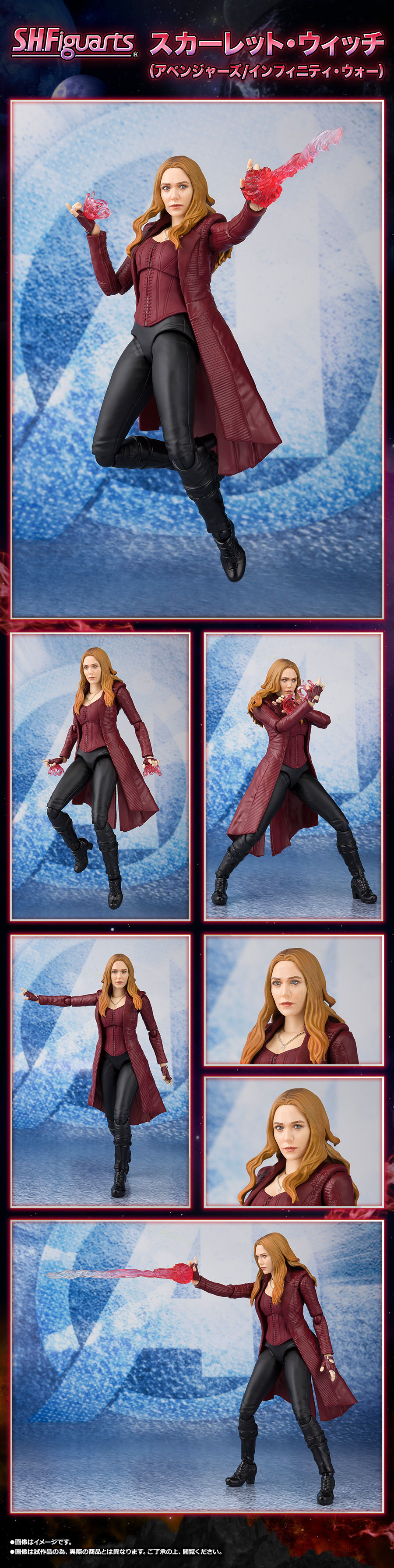 這次依循《復仇者聯盟》系列電影的設定來製作其身上紅色服裝,運用魂3D彩色列印技術將飾演「緋紅女巫」 的女星「伊莉莎白·歐森(Elizabeth Olsen)」頭部精彩再現,作品當然一定要附有劇中紅色魔法特效配件,還有交換用手首左右各3種、交換用頭雕配件(目線換え)、交換用髪配件等等,此作預計將於Premium BANDAI線上商店於2019年6月28日開始接受訂購,喜愛《復仇者聯盟》電影系列的玩具人可以參考一下歐!