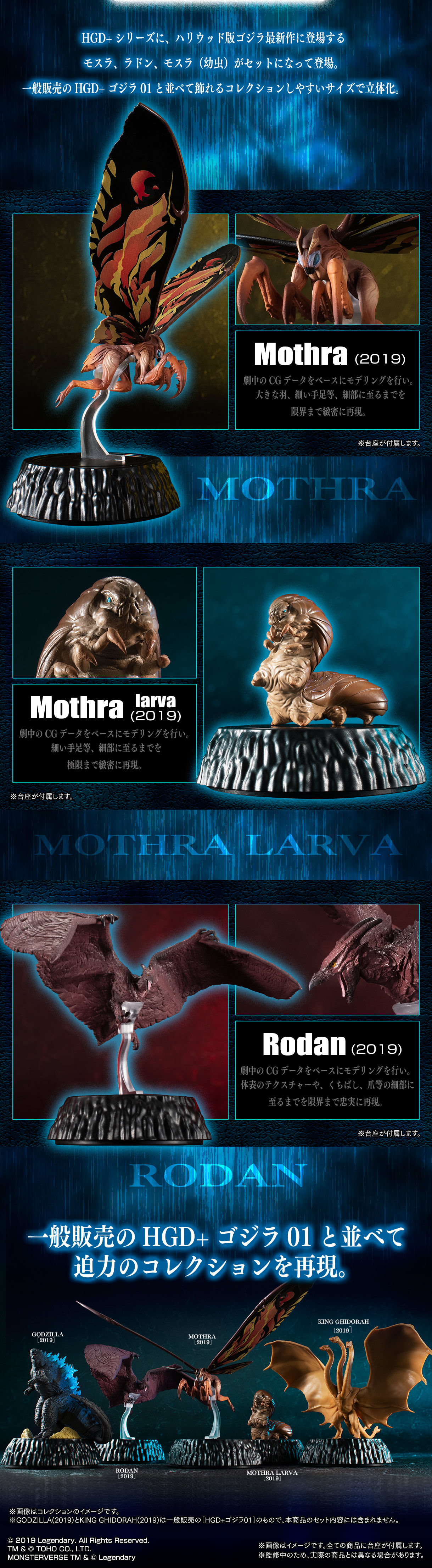 由萬代玩具公司轉蛋事業部 GASHAPON 推出,將 HG(HIGH GRADE REAL FIGURE)系列轉蛋加上場景、特效的全新『HGD+』系列繼《哥吉拉》第一彈後,今(28)日再度發表了出自《哥吉拉2:怪獸之王》的特別彈「HG D+ EX01 摩斯拉&拉頓&摩斯拉幼蟲套組」預計於 2019 年 11 月發售的消息。