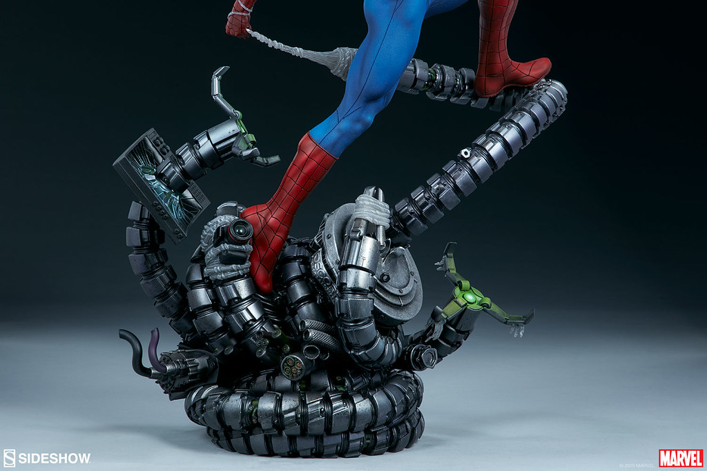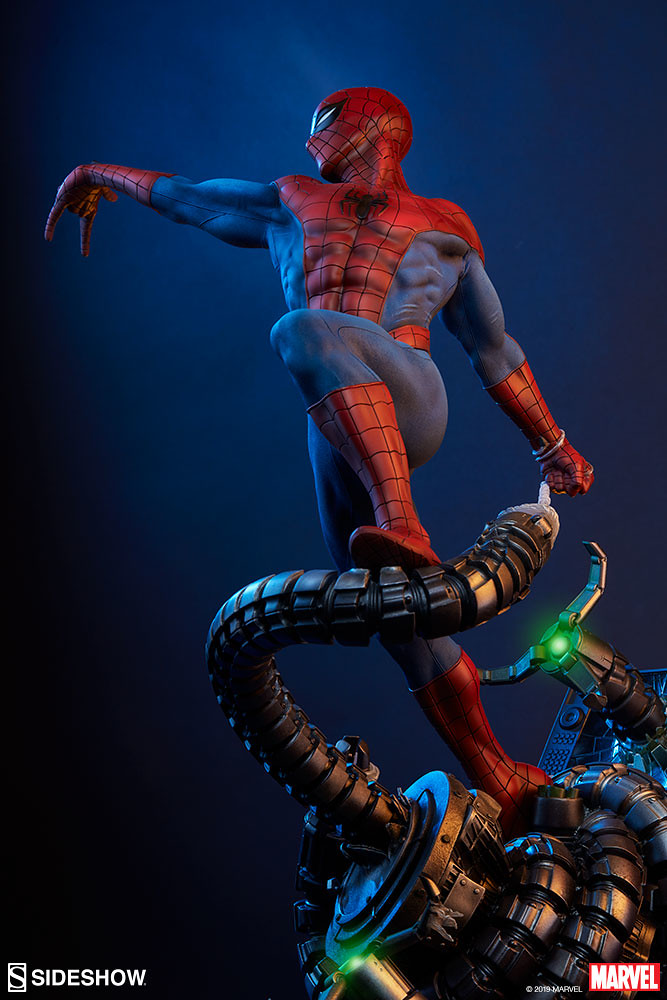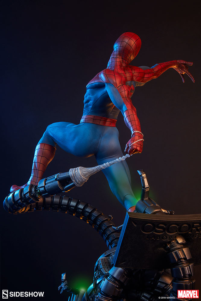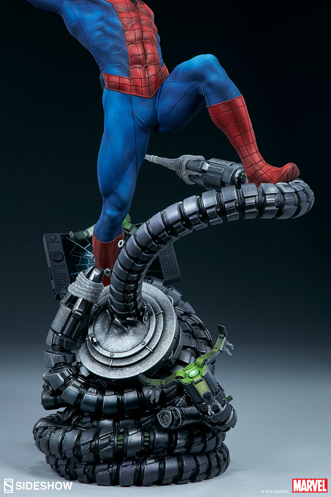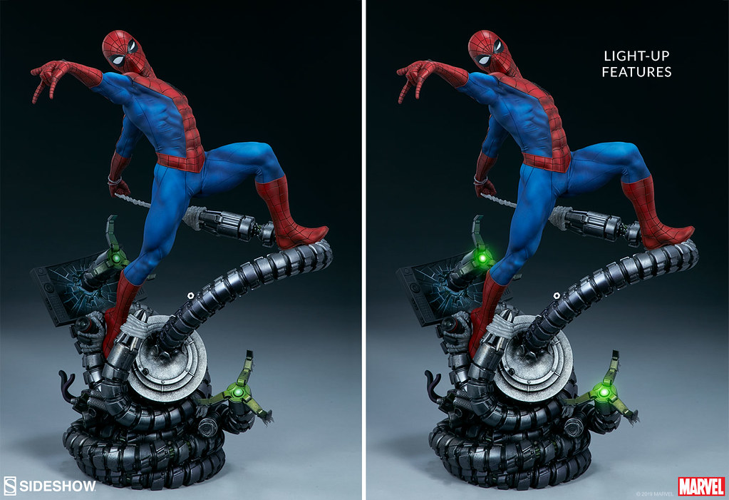 「Premium Format Figure 蜘蛛人」高約57 公分,整體是以蜘蛛人闖入宿敵之一「八爪博士」的實驗室為題製作,蜘蛛人展現出極為躍動的禦敵姿態,以左手、左腳壓制住其中一根機械觸手,右手則表現出正要發射蜘蛛絲的樣貌,肢體表現可說是張力十足!貼身戰衣還原了漫畫的經典造型,細緻的上色表現出複合式材料的質感、紋理差異,並逼真地形塑出緊身衣底下的肌肉線條、形狀,以及因動作而產生的皺褶,相當精彩!