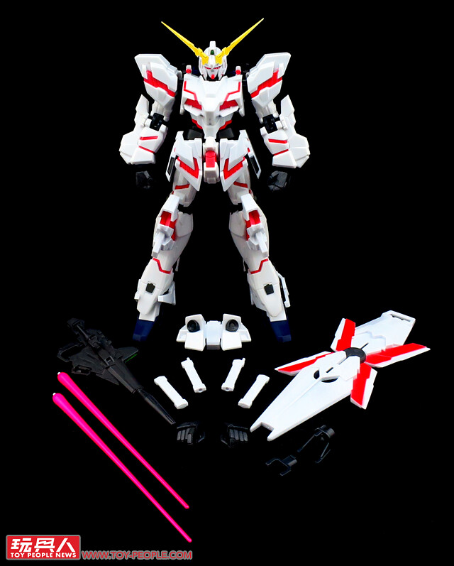 ▼ RX-0 獨角獸鋼彈則收錄了光束麥格農步槍、光束軍刀柄、光束軍刀刃、盾牌、替換手掌、盾牌握柄、支架轉接零件。