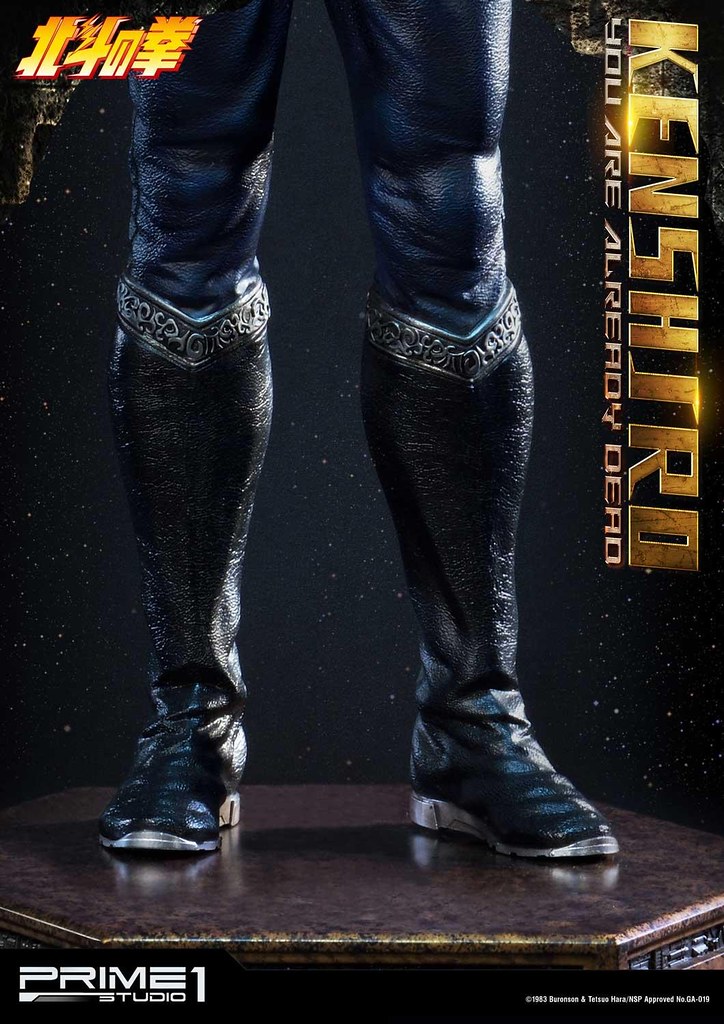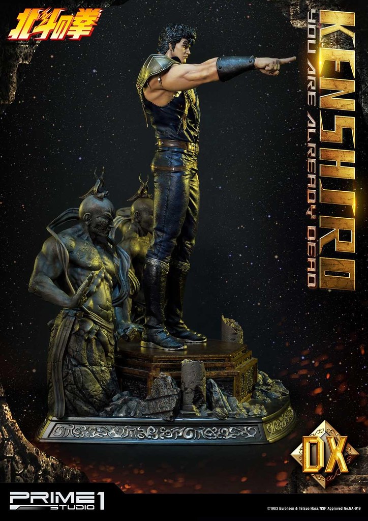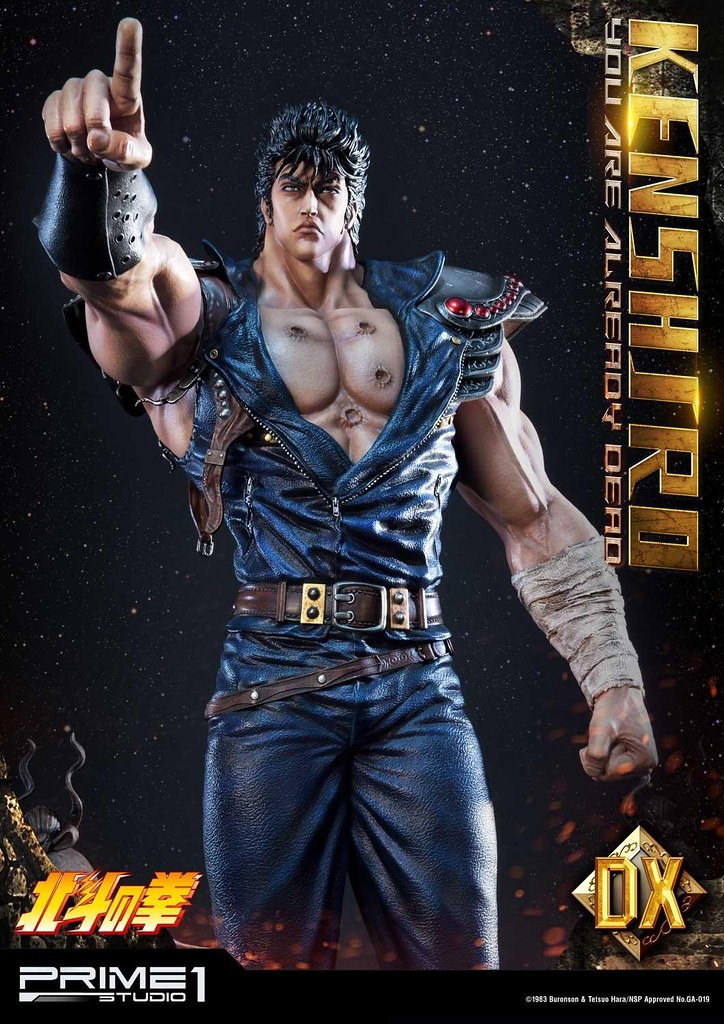 「拳四郎 你已經死了 1/4 比例全身雕像」高約68.9 公分,服裝設定基本上與前作相同,但讓拳四郎擺出了以右手指向敵人的動作,銳利的眼神極具魄力,髮型、胸口的傷痕、手臂爆起的青筋皆逼真地形塑,粗壯的肌肉在陰影效果的襯托之下顯得更加厚實、立體,衣服的皺褶、繃帶的破損質感也十分細膩,並以精湛的塗裝展現出肩甲、服裝、長靴與繃帶的相異質地。