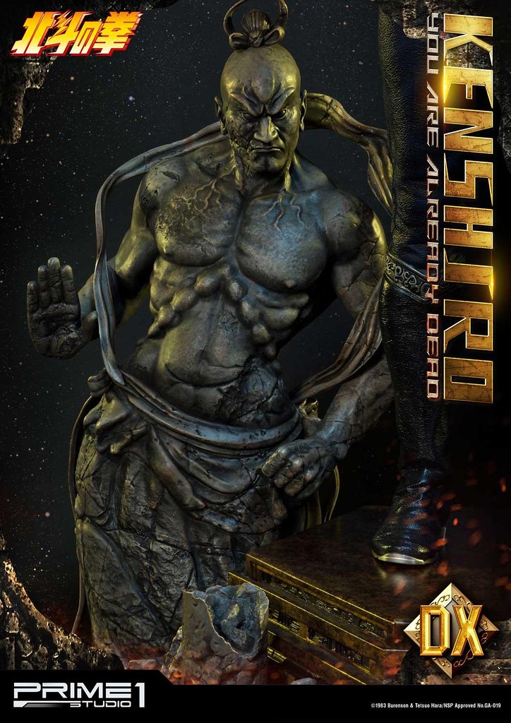 DX版則追加了象徵北斗神拳與南斗聖拳相互對應的仁王像「阿與吽」的華麗地台,高度來到70.9 公分之外展示起來也更具份量,阿與吽的面容威懾感十足,石像的岩石質地、各處的破損裂痕也都展現出P1S 的高製作水準。