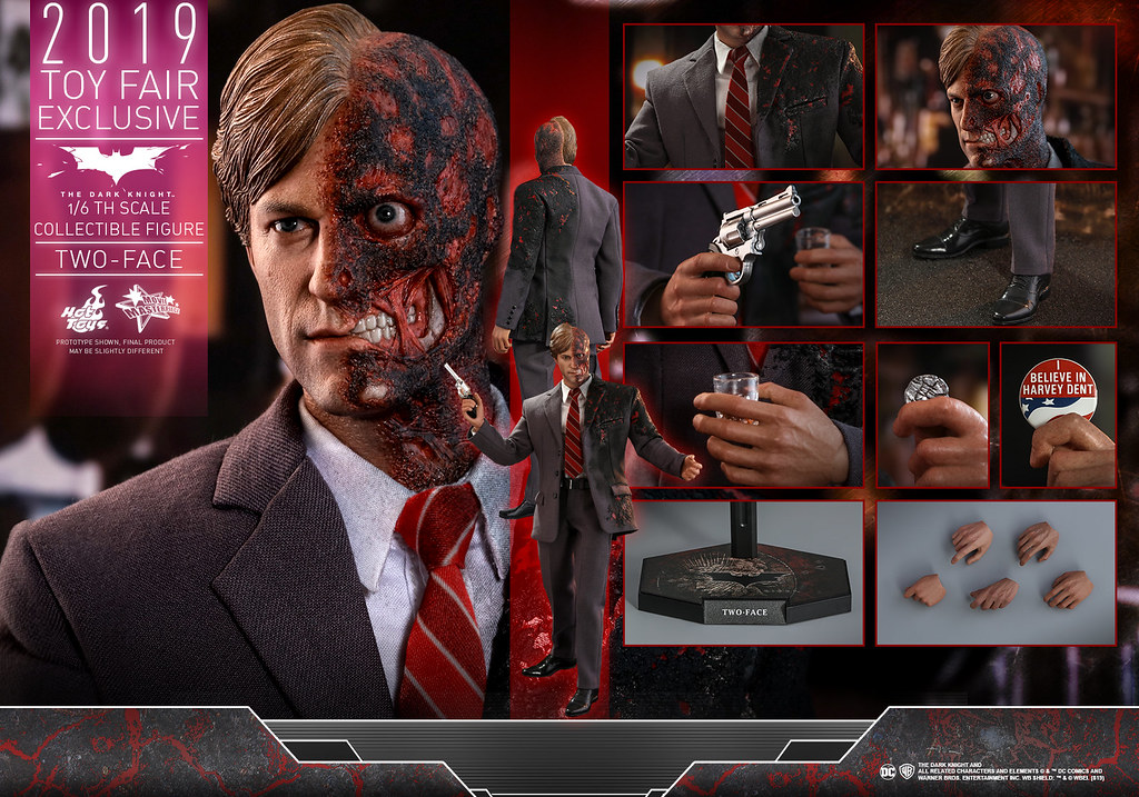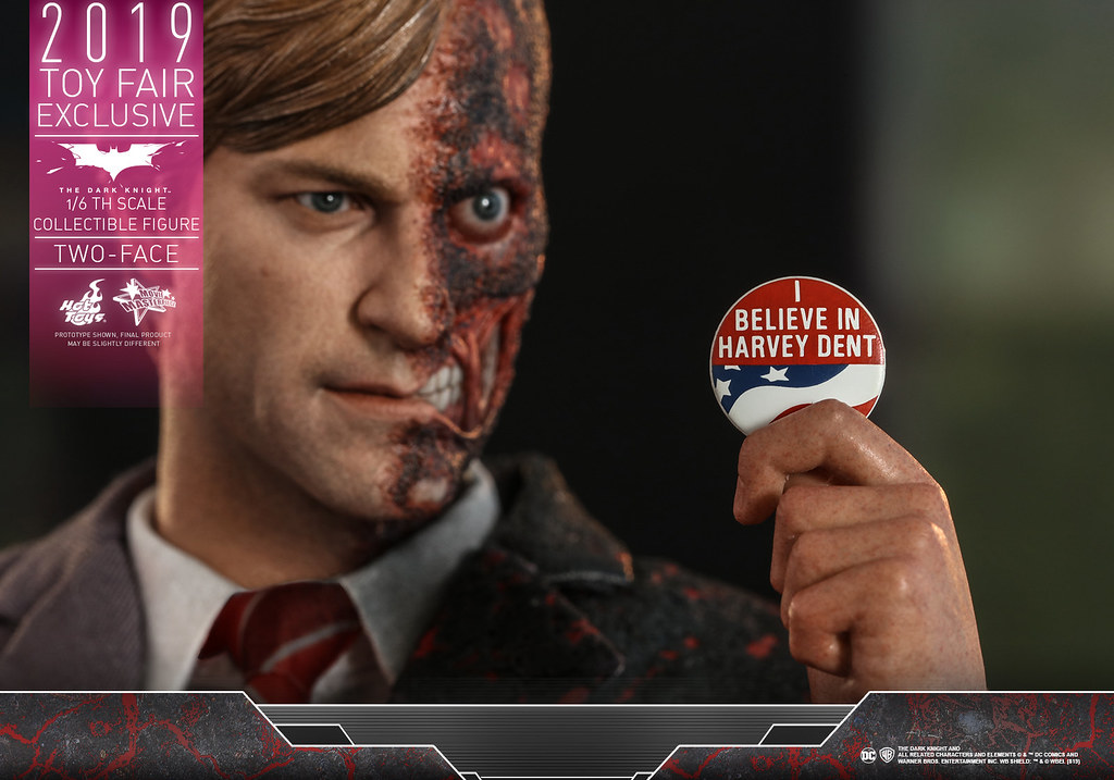 雙面人所穿的灰色西裝、白襯衫在左半邊也做出了燒焦、污損的痕跡,配件部分包含酒杯、三枚用來決定事情的硬幣、印有「I BELIEVE IN HARVEY DENT」字樣的徽章、左輪手槍,以及多個替換手型,那精彩的頭雕實在是令人期待啊!