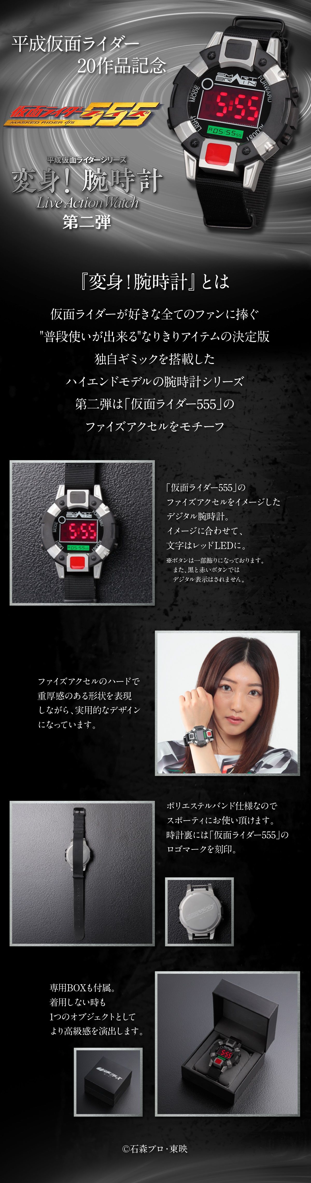 之前知名日廠Bandai萬代玩具公司已經推出過「假面騎士1號 變身腰帶造型手錶」、「假面騎士V3 變身腰帶造型手錶」、「假面騎士響鬼 音撃鼓裝備帶 變身造型手錶」、「假面騎士BLACK 變身腰帶 造型手錶」以及「假面騎士ZI-O 手錶 ZI-O」等等穿戴式手錶配件,相當受到喜愛《假面騎士》系列玩具人們的歡迎,這次將繼續推出《假面騎士555》「假面騎士Faiz 變身!手錶(ファイズアクセル 変身!腕時計)」(名稱暫譯),官網近日公開其宣傳照片以及販售相關資訊。