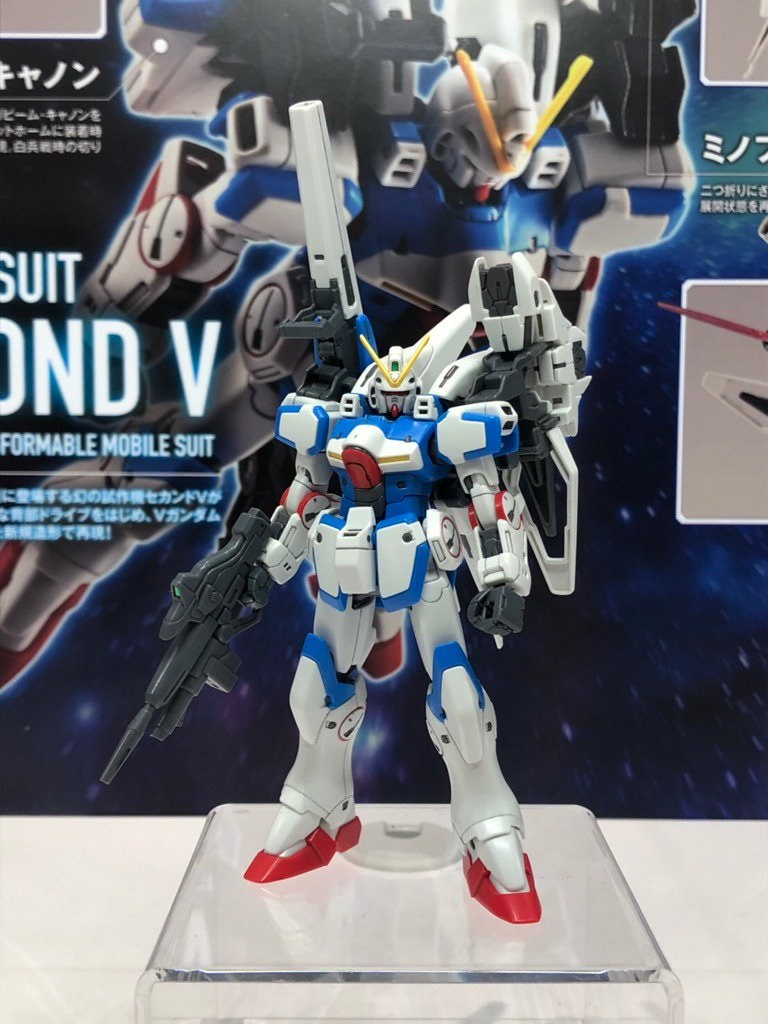 「HG 1/144 Second V」依據 KATOKI HAJIME 繪製的設定畫稿為基礎製作,本體沿用了過去推出的「HG V鋼彈」套件,手肘、膝蓋、側裙甲等多處裝甲以新規零件呈現,背部米諾夫斯基推進組件、MEGA光束加農砲、米諾夫斯基盾牌等特徵武裝也是全新製作,能透過替換零件方式再現展開狀態。