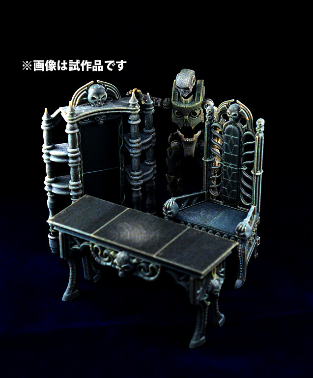 本次的「骷髏素體&魔傢俱」附屬了新色(白&黑)的骷髏素體與替換手,以及魔椅子、魔桌子、魔鏡這三種魔傢俱,傢俱部分施以深褐色的塗裝,並飾以骷髏頭跟豐富的立體雕紋細節,真的是鬼氣逼人啊~值得一提的是魔鏡款是真的有附上一片鏡子~好想把這些風格特異的傢俱全部買起來啊!