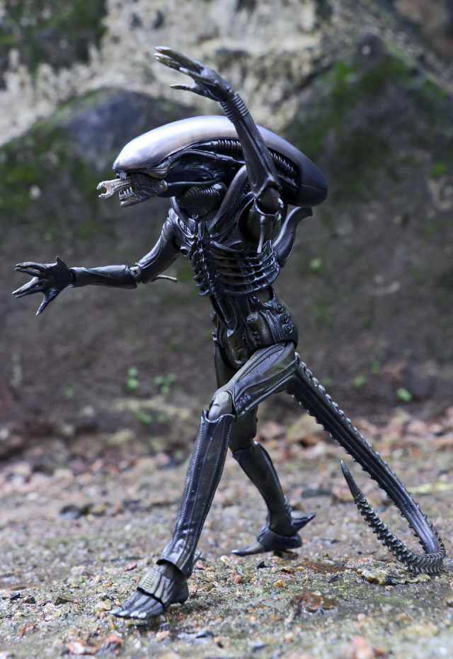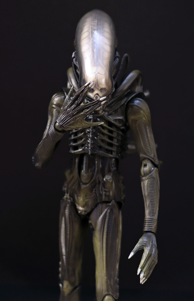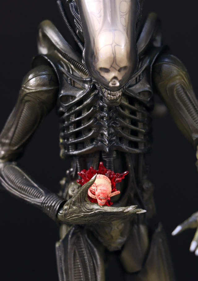 本次的造型是來自1979年《異形》裡的 Big Chap Alien。異形高約 20.5cm,一如既往,人偶以精緻的細節刻畫出異形恐怖的樣貌,全身以特殊的肌肉紋理和構造所組成。她的最大特點 - 頭部以半透明部件將內裡的骷髏形狀清晰地完全再現。本體除了擁有多處可動關節之外,尾巴也可以隨意彎曲。內嘴(inner mouth)以更換部件方式重現而提高了可玩性!除了附屬的兩對造型手外,還包括了抱臉體和破胸體等配件,隨意放在一個1/12 的 SHF 或其他人偶胸膛上都會很好玩吧!