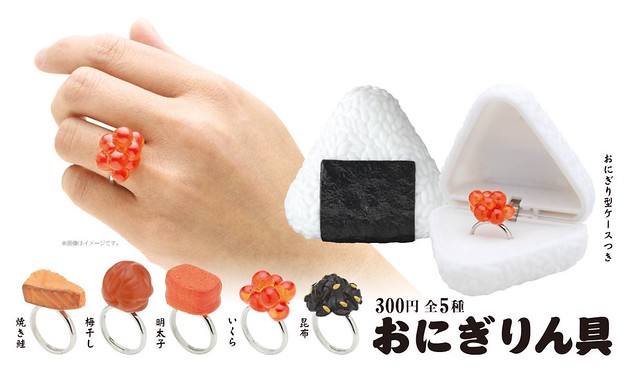 求婚之前,挑選一個會讓未來的老婆一看就心花怒放、又美又有氣質的戒指絕對是非常非常重要的吧~!如果各位玩具人的女友也懂吃、或是喜歡有趣的小驚喜,這次的「飯糰的餡料戒指」絕對很適合拿來求一波XD!直接採用包裹著海苔、粒粒分明的三角飯糰來當戒指盒與代替轉蛋殼,實在是超可愛~而戒指上原本的鑽石則改成各種飯糰會包的餡料,包含昆布、鮭魚卵(いくら)、明太子、梅干(梅干し)、烤鮭魚(焼き鮭) 五種。