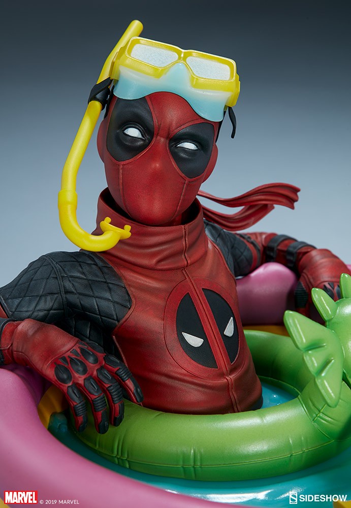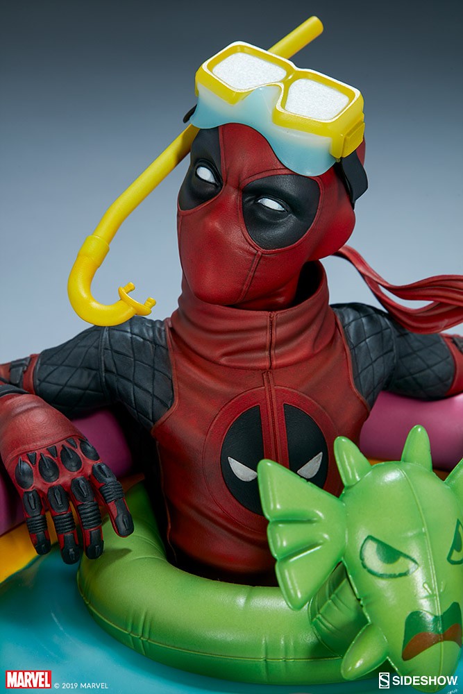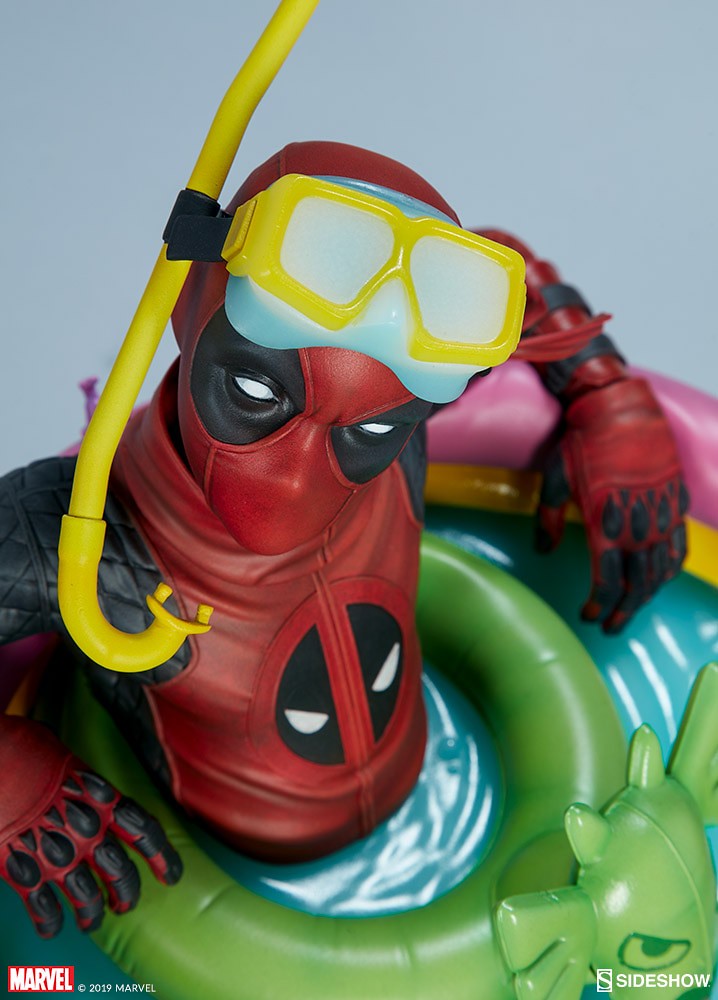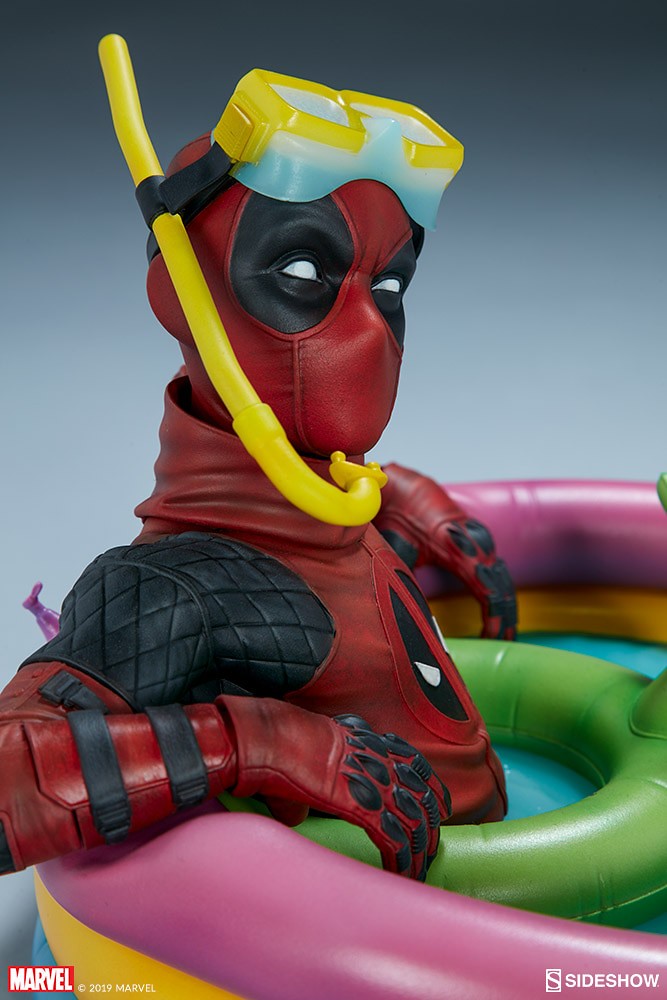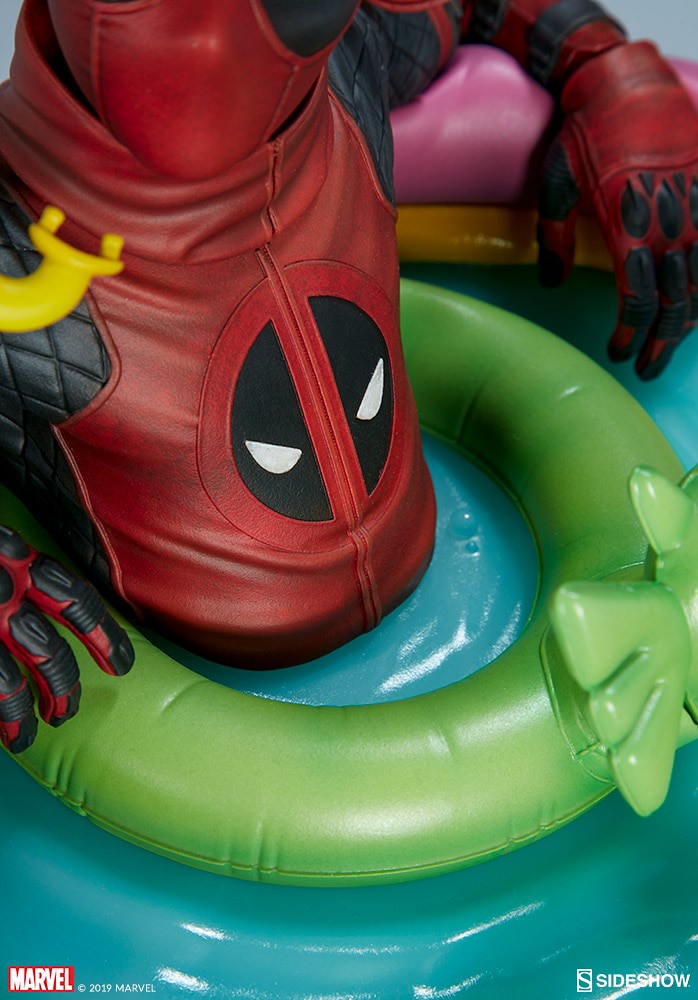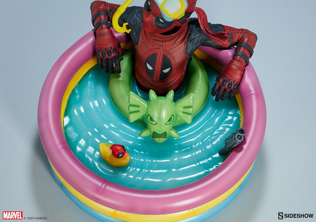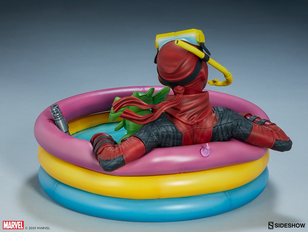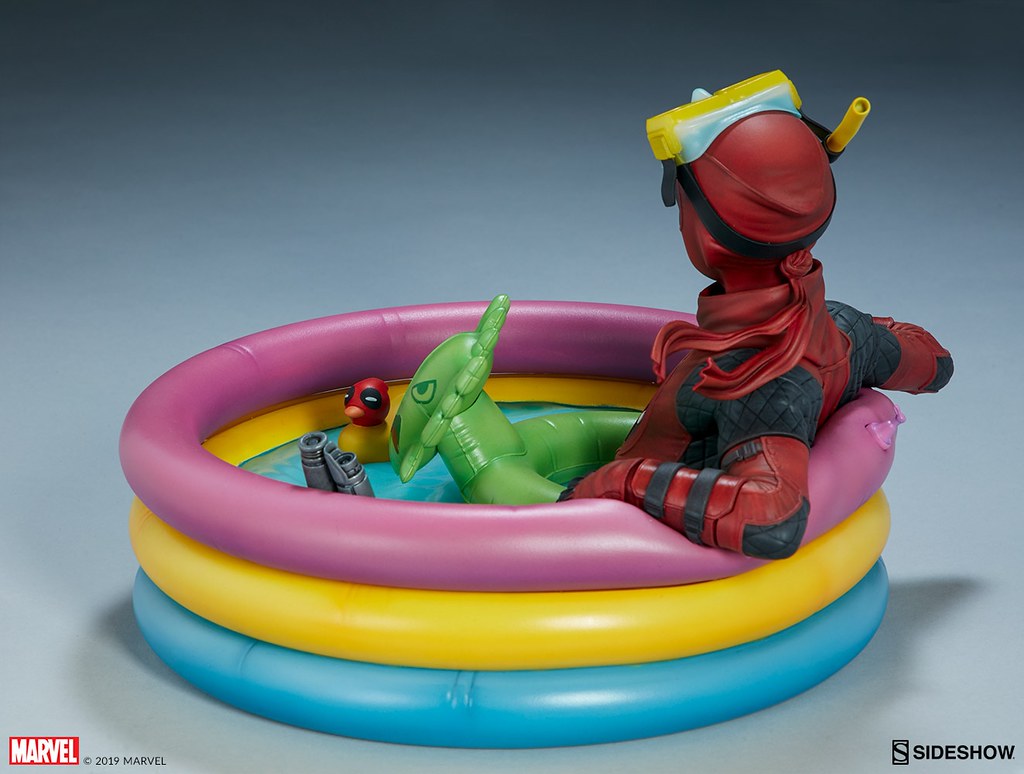 「Premium Format Figure 死侍小子」高約17.7 公分,以他坐在充氣泳池裡的造型設計,雙手靠著泳池的邊緣感覺起來非常悠閒~紅黑配色的死侍服裝、泳圈、充氣泳池......等皆刻畫出豐富的細節與皺摺,並以塗裝逼真地表現出皮革、橡膠、塑膠的相異材質,頭上還戴著附屬呼吸管的泳鏡,而除了死侍小子本體之外,本作還有像是綠色巨龍「Fin Fang Foom」主題的泳圈、套上死侍面罩的橡膠黃色小鴨,以及死侍小子最愛的兩隻光劍這些元素!超讚~