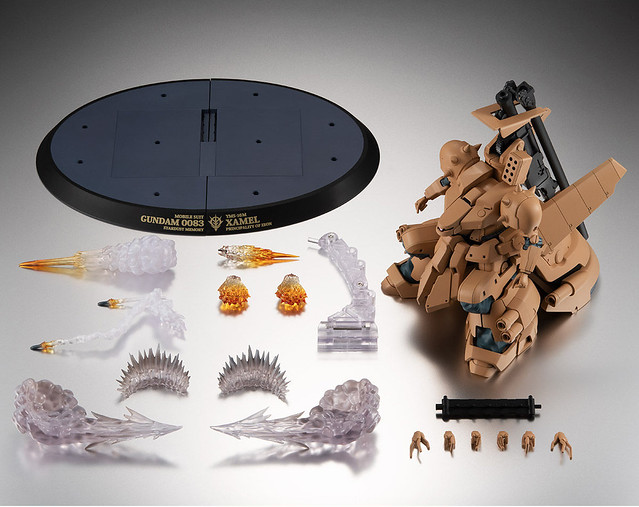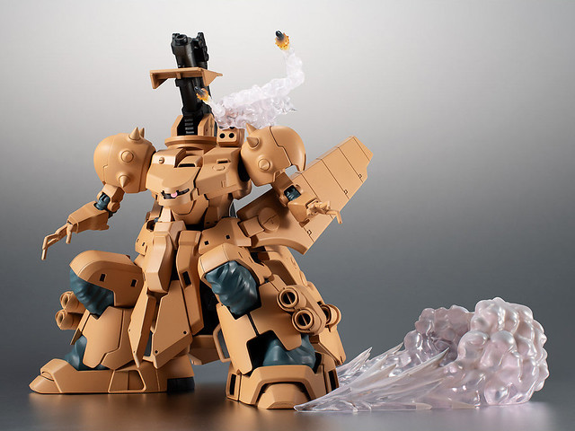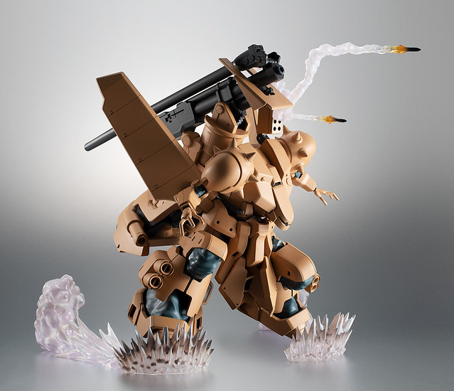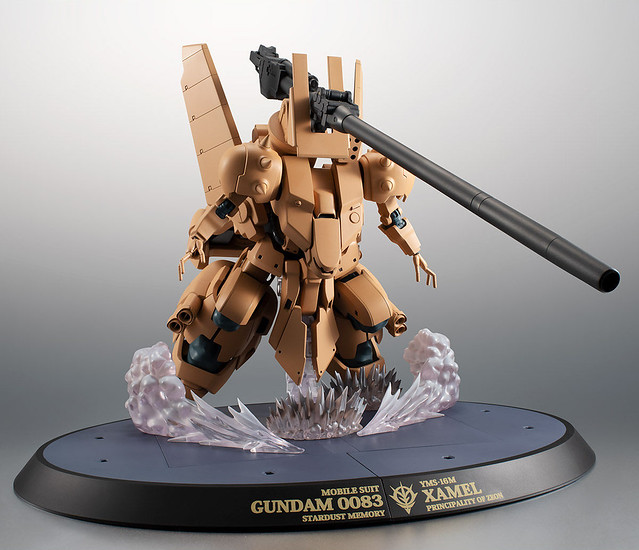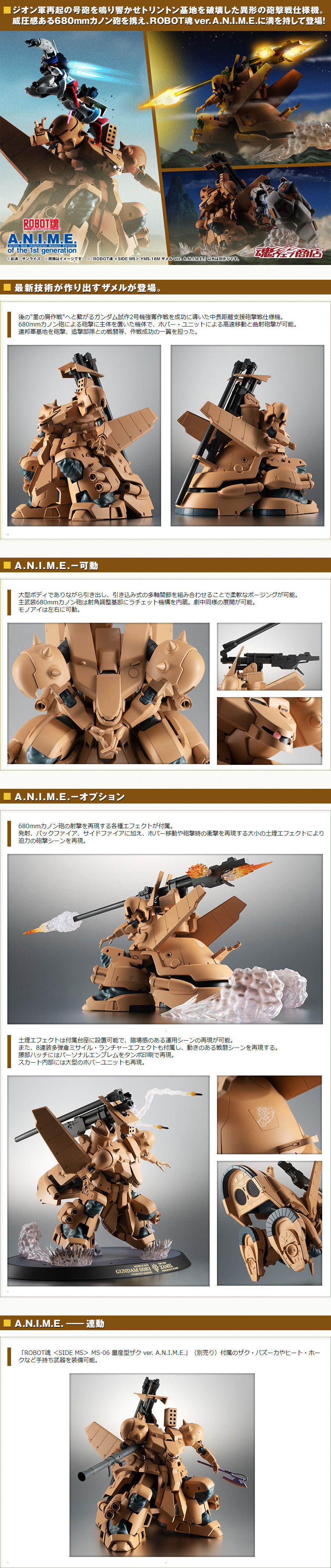 「ROBOT魂 YMS-16M 札梅爾 ver. A.N.I.M.E. 」造型忠實再現劇中設定,並透過最新技術製作出色的可動,單眼攝影機能左右轉動、大型身軀中藏多段結構的拉出式關節,能做出自然柔軟的姿勢。而背部代表性的主武裝「680mm加農砲」則能像劇中一樣折疊展開、以棘輪構造調整基部角度。同時還附上砲擊、退彈、沙塵、飛彈發射...等多種特效以及專用台座,展示極具魄力的戰鬥姿態!