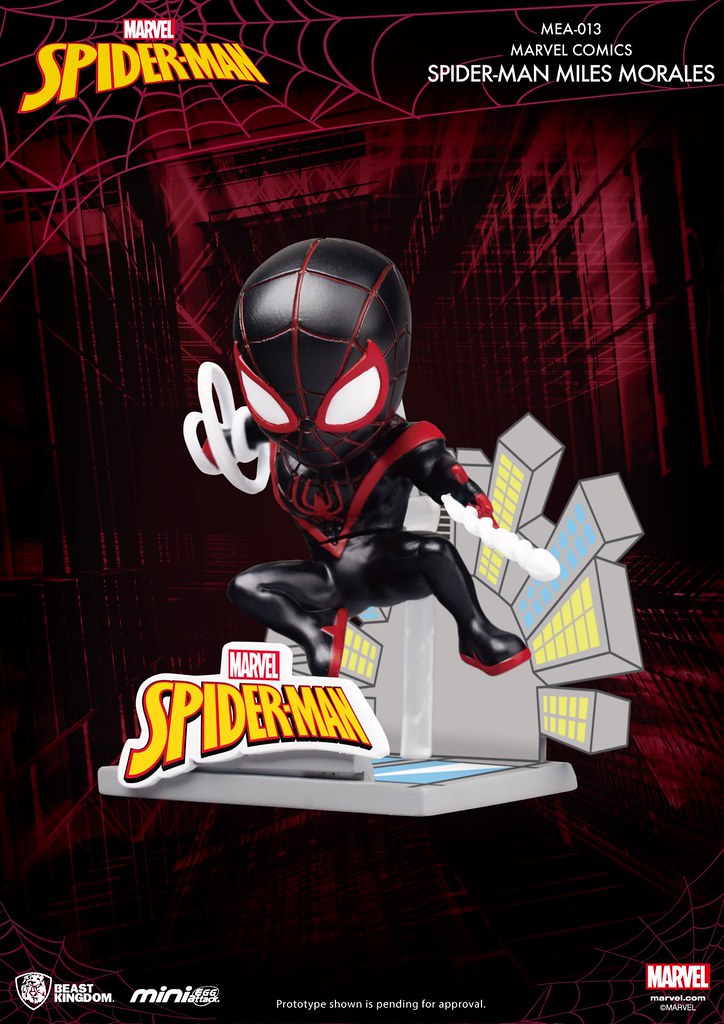 本次的「MEA-013 漫威英雄 - 蜘蛛人」包含了蜘蛛人、終極蜘蛛人邁爾斯、蜘蛛關、猛毒四款作品,以本系列獨特的Q版比例重新詮釋,並搭配經過變形的高樓大廈背景,在約7.6 公分的尺寸中,再現了蜘蛛人們發射蜘蛛絲、在都市裡擺盪的躍動姿態,而魁武的猛毒在這2~3 頭身的比例下,展現出更為誇張的視覺效果,極具魄力!