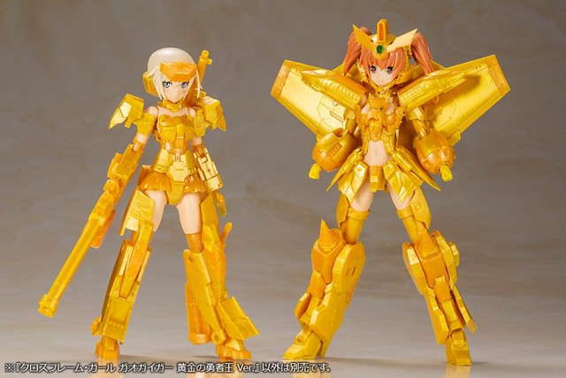 「CROSS FRAME GIRL 我王凱牙 黃金勇者王Ver.」交由日本插畫家駒都英二設計美少女化的形象,套件與先前發售的一般版相同,運用『骨裝機娘』系列出色的可動素體技術、結合充滿原機風格的武裝零件,並將成形色替換為多種金色,全機金到不行!能像原作中一樣逐步合體,從只有素體的可愛「GIRL」狀態逐步換裝成貓娘「伽利歐(Galeon)」狀態、「凱牙(GaiGar)」狀態,最後再與三架 SD 比例的 Gao 機械合體為「我王凱牙」!