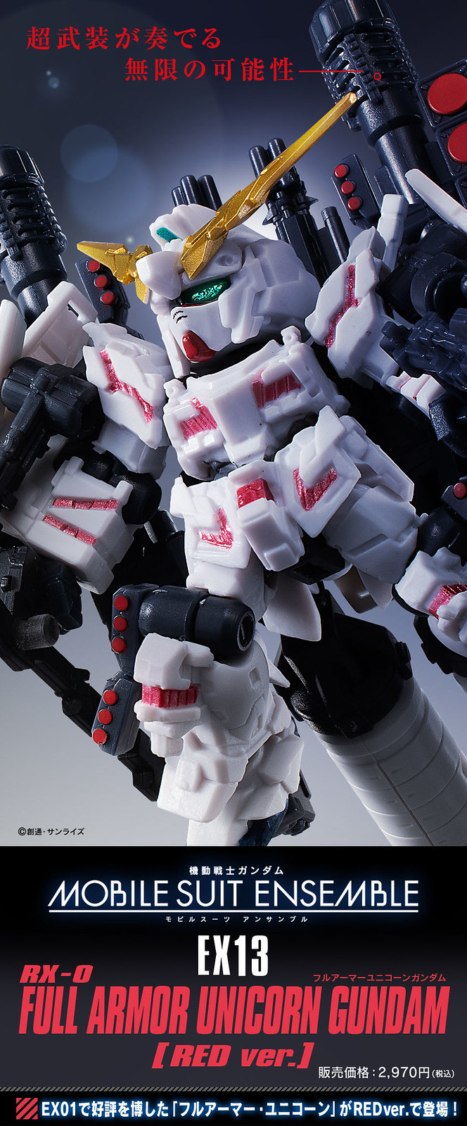 日本萬代玩具公司轉蛋事業部「GASHAPON」發行,以共同接點、無限換裝為特色的《機動戰士鋼彈》轉蛋玩具「MOBILE SUIT ENSEMBLE」系列今(19)日發表出自《機動戰士鋼彈UC》的最新商品「EX13 全裝甲型獨角獸鋼彈(REDver.)」預計於 2019 年 11 月發售的消息。