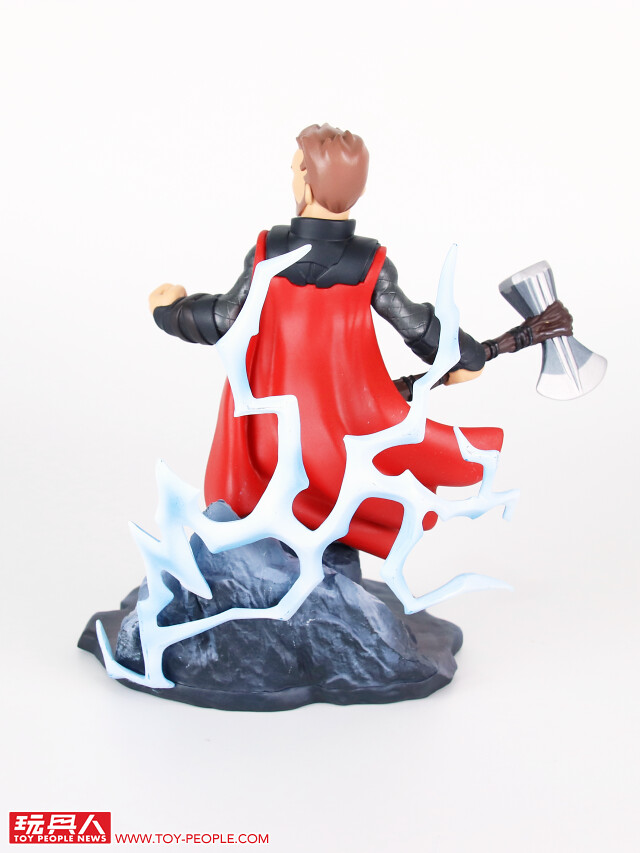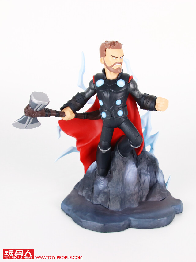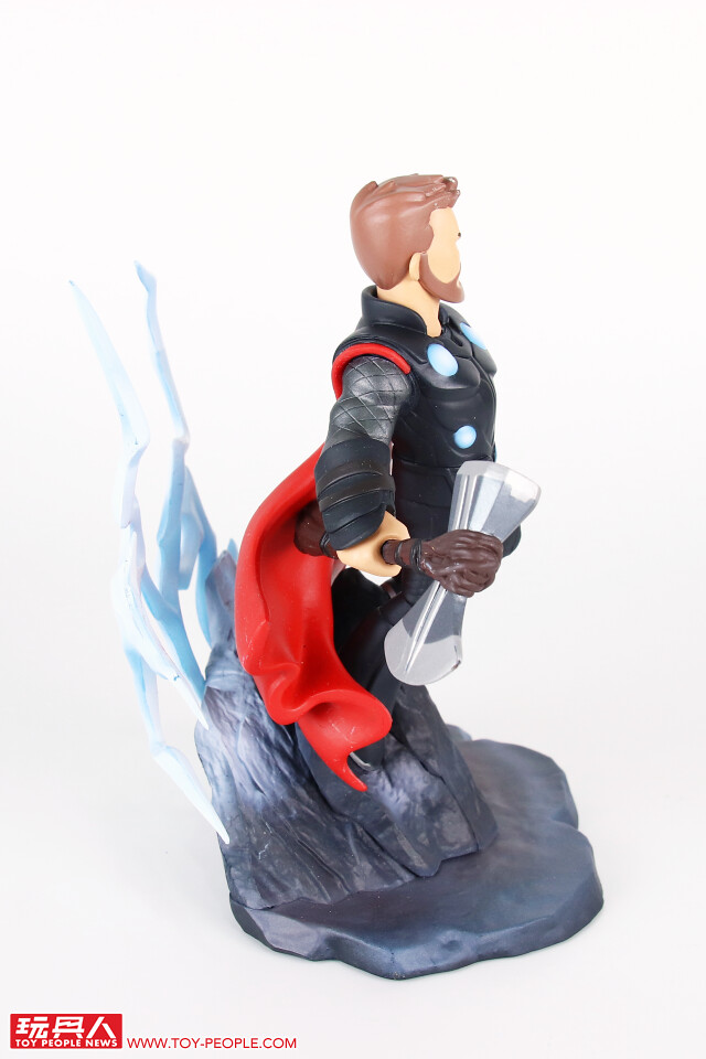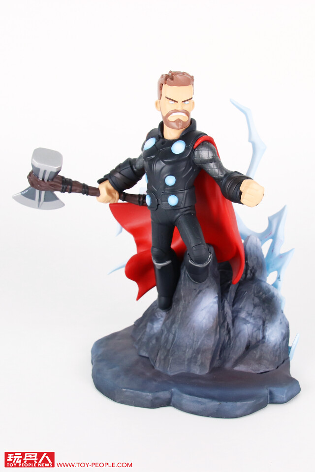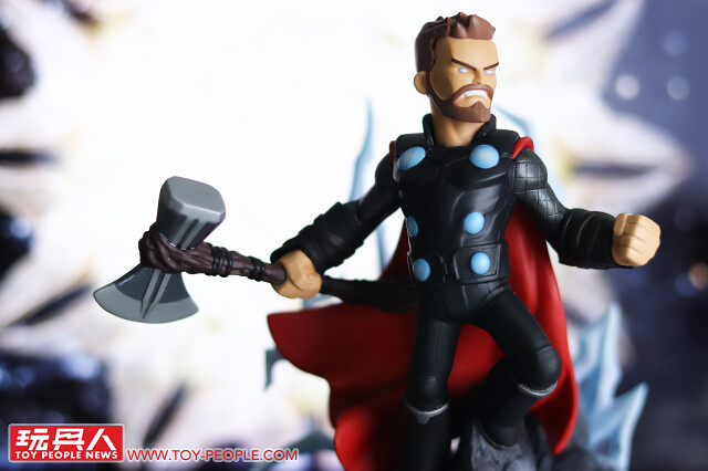 索爾是以《復仇者聯盟:終局之戰》前半段、仍然結實的短髮造型製作,雙眼外圈施以藍色塗裝,手握風暴毀滅者、加上咬牙表情、閃電造型的特效件,展現出索爾力量全開的魄力姿態!護甲的刻線與細部造型有著精美的描繪,形塑出飛舞動感的披風使本作張力再提升,陰影塗裝則讓皺褶更為鮮明立體。