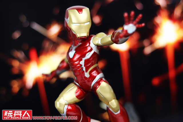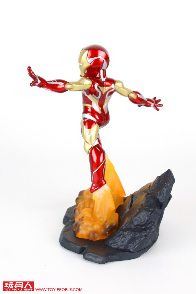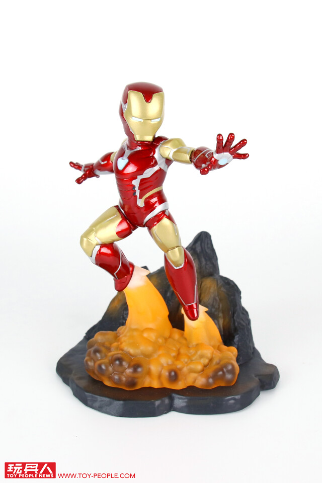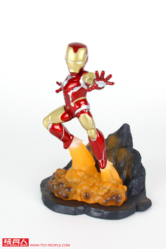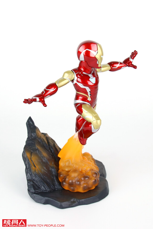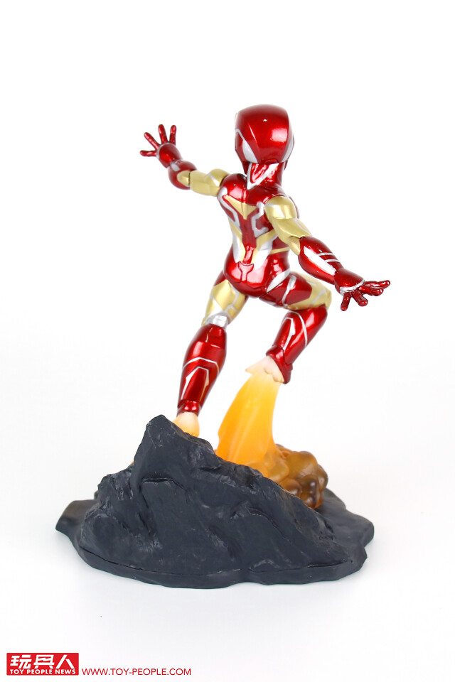 鋼鐵人紅金主調的盔甲施以金屬感上色,表面光澤十分亮眼,並高度還原了刻線細節,跟電影設定中,裝甲更具肌肉感的線條相比,這款鋼鐵人有著更為圓潤的體態表現,腳底的噴射特效件、煙霧與火花混合的漸層色也很不賴,就連岩石地台都描繪出了被火光照射的樣貌。