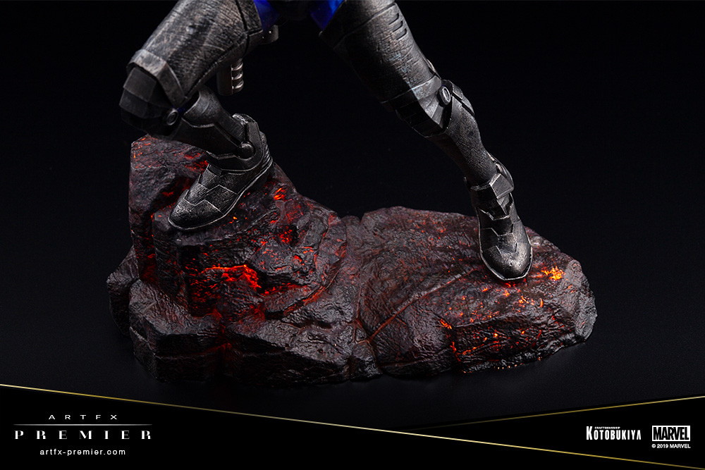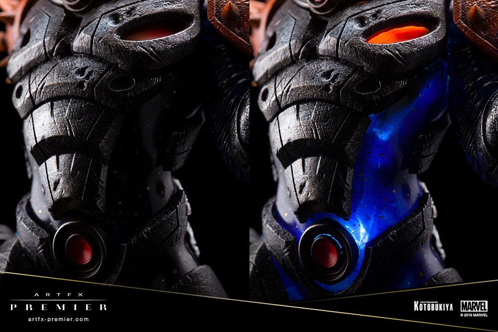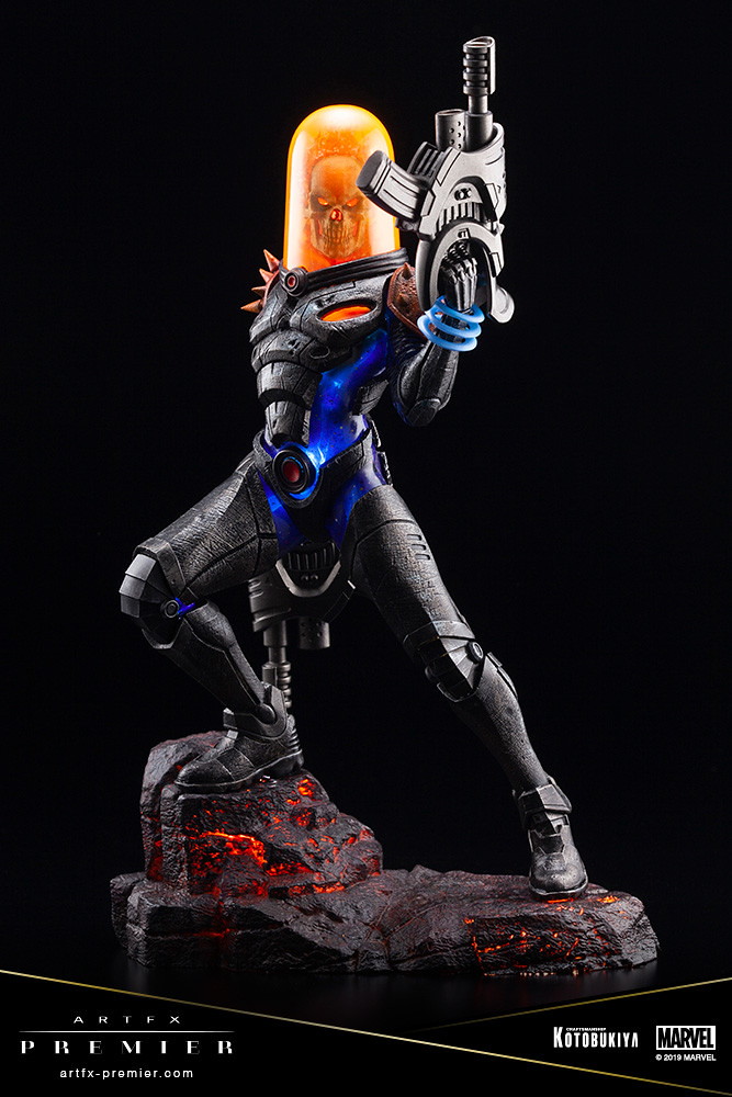「ARTFX PREMIER 宇宙惡靈騎士」高約22 公分,以精湛的製作技術再現其頗具科技感的護甲與武器、猙獰的骷髏頭,以及熊熊燃燒的火焰,盔甲施以厚重的金屬感上色,逼真的舊化戰損完美表現出宇宙惡靈騎士身經百戰的設定,本作搭載的LED 發光功能可以在本體的頭、胸、腹部分與地台發出光芒,進一步還原他在漫畫原作中的樣貌,令人興奮的是,頭罩與鎖鏈可以取下,展示起來變化性再提升,喜歡宇宙惡靈騎士的玩具人真的可以考慮入手啊!