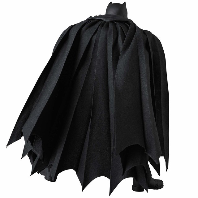 「MAFEX 蝙蝠俠 (The Dark Knight Returns)」高約16 公分,再現了漫畫中蝙蝠俠魁武壯碩的身軀與胸前肥厚的蝙蝠標誌,除了逼真的肌肉形狀外,面罩與貼身戰衣的皺褶、腰帶上口袋的細節都施以精緻的雕刻,陰影塗裝則讓肌肉線條更為立體,使這尊蝙蝠俠給人的壓迫感再提升!披風是以布料材質製作,本作能呈現嚴肅、咬牙兩種表情,搭配多枚蝙蝠飛鏢、多個替換手型與支架,再現蝙蝠俠經典的飛躍、以及各種極具威懾感的硬派姿態!