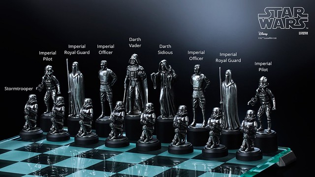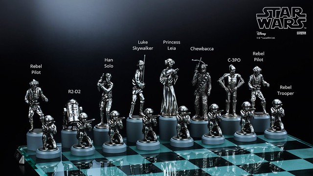 本次的「星際大戰經典西洋棋組」收錄了《星際大戰經典三部曲》的帝國軍、反抗軍兩方人馬,並在約6~13 公分的高度下,細緻地刻畫出每個經典角色的神韻與造型特徵,用那些流傳了四十年依然人氣不減的角色:達斯·維德、達斯·西帝、路克·天行者、韓·索羅,以及呈現跪姿射擊動作的帝國風暴兵與反抗軍士兵對決實在是超熱血超開心啊!要注意的是由於反抗軍收錄的角色較多,會有不同人物代表同樣棋子的狀況,像是韓·索羅、丘巴卡代表「主教」,C-3PO、R2-D2 代表「騎士」,在遊玩時別忘記囉~!
