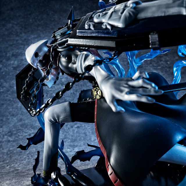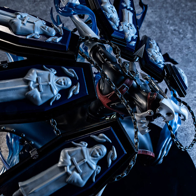 「GCCDX 塔納托斯」由美術總監副島成記擔任監修,以全高 30 公分的魄力尺寸製作出塔納托斯帥氣的揮刀瞬間,細膩雕塑躍動的姿勢、服裝微小的細節,漂浮的鎖鏈串連數個刻劃出浮雕的棺材,加上纏繞身旁的複雜青色特效,為作品增添強大的存在感與氣勢!