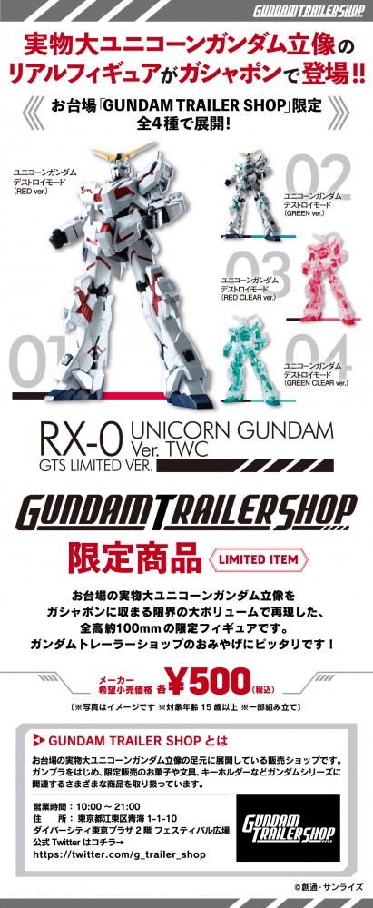在日本台場的「DiverCity Tokyo 購物中心(ダイバーシティ東京プラザ)」的獨角獸鋼彈巨大立像,已經是讓世界各地鋼彈粉絲們計畫前往朝聖的地點之一,這次將推出「RX-0 獨角獸鋼彈 TWC GTS LIMITED VER.」以立像為題材的限定轉蛋商品,將只於立像旁的「GUNDAM TRAILER SHOP」商店限定販售,近日計畫前往東京不彷可以前往台場轉幾個當伴手禮歐!
