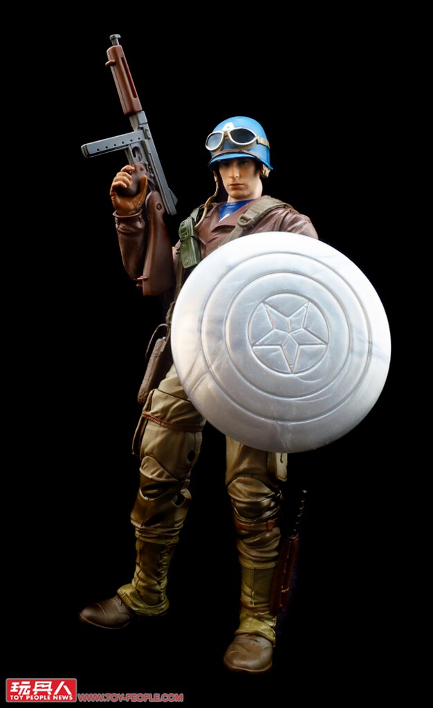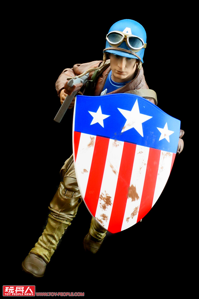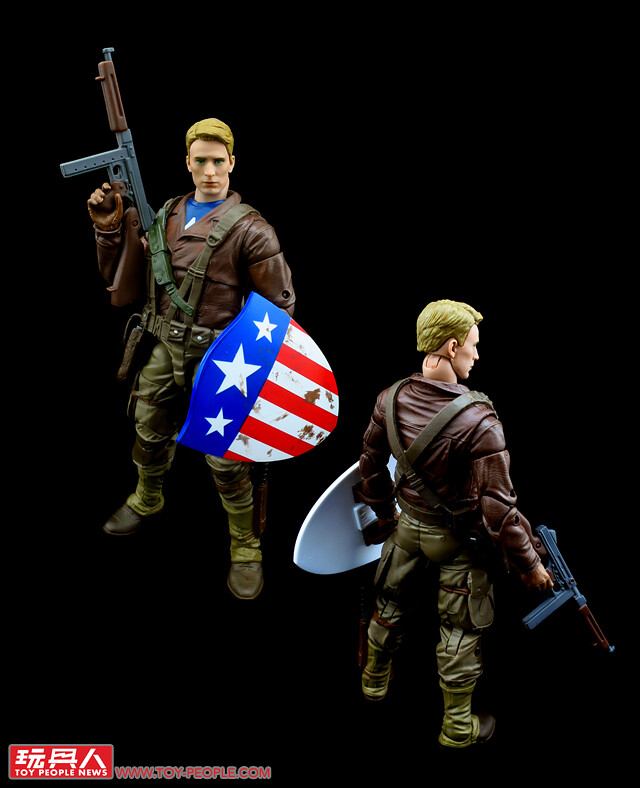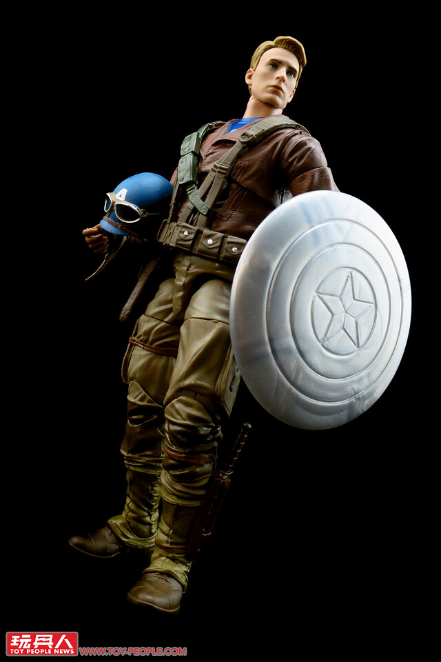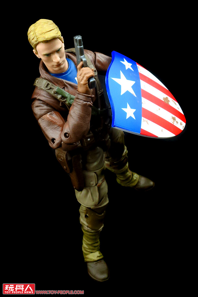 ▼「美國隊長」(Captain America),本名史帝夫·羅傑斯(Steven "Steve" Grant Rogers),在注射超級士兵血清(Super-Soldier Serum)後成為二戰時期的戰爭英雄「美國隊長」。本次的人偶造型,取材自電影中史帝夫潛入九頭蛇(Hydra)兵工廠搭救好友巴奇(James Buchanan "Bucky" Barnes)所著的裝束,這段劇情是隊長第一次在戰場上大放異彩、揚眉吐氣的起點,漫威傳奇系列選擇這個造型並加以重現,可說是相當具有代表性。
