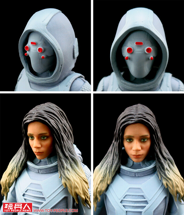 ▼附屬了著盔版的帽兜頭雕、以及脫盔的裸顏頭雕和折疊在後頸的帽兜零件,可依個人喜好自由替換。其中,裸顏頭雕巧妙地還原了演員漢娜·約翰-卡門(Hannah John-Kamen)的神蘊,還原度之高真的讓人嘖嘖稱奇。