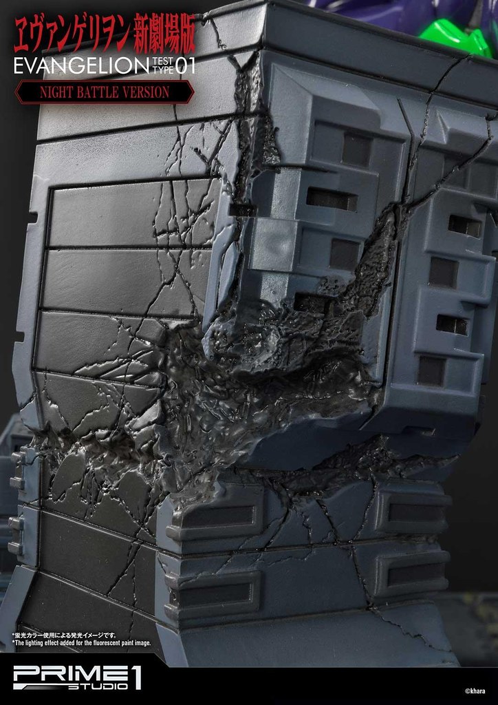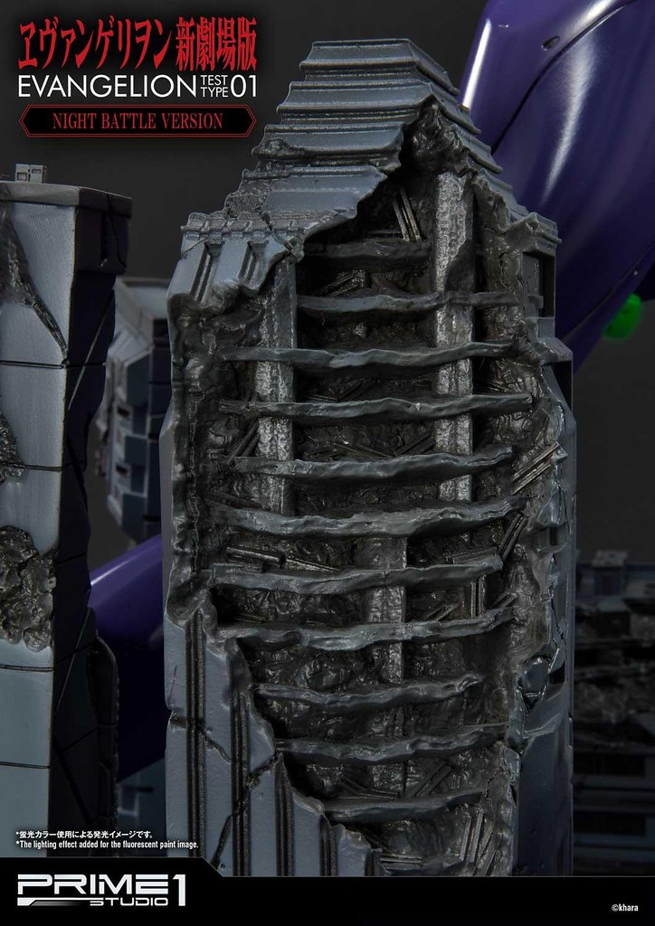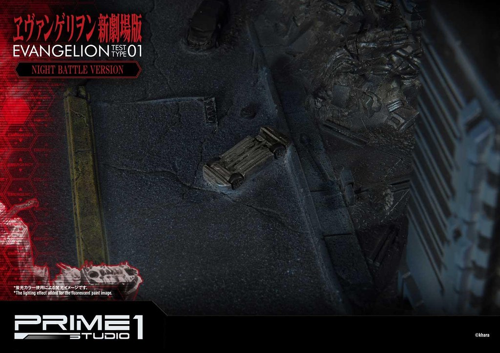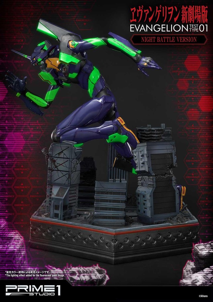 本作尺寸為高76.8 × 寬61.4 × 長68.3 公分,初號機展現出極具張力的衝刺姿態,頭部是以暴走後怒吼造型設計,但右眼部分完好,沒有以《序》中的毀壞樣貌製作,並搭載LED 發光機能,點亮之後更具臨場感,初號機機體的刻線、EVANGELION TEST TYPE-01 字樣、部分的金屬質感表現皆細膩地打造,情報量十分豐沛!以第3新東京市的為題製作的場景地台,在建築部分也採用較暗色調的新版塗裝,大樓、街道的毀壞痕跡也以高度造型力完成!