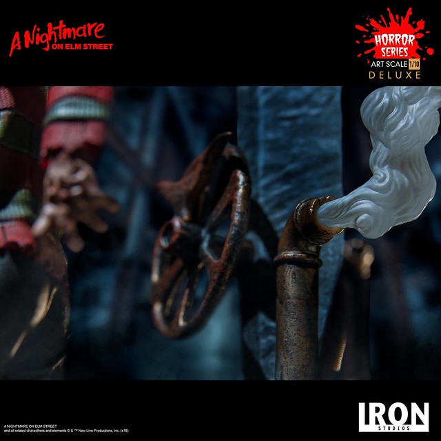 「佛萊迪·庫格 1/10 比例全身雕像」高約19.5 公分,依據電影設定,考究地再現了佛萊迪的經典外觀,經過嚴重燒傷的爛臉尤其逼真,坑坑疤疤的皮膚表面與細緻的漸層塗裝,實在是越看越不舒服XD~紅綠相間的毛衣形塑出寫實的皺褶以及下擺、袖口的破損,銳利的剃刀手套展現出精美的上色與金屬厚重感,在豪華版中還追加了以劇中場景為題設計的展示地台,欄杆、煙管、轉盤的鏽蝕、毀損處理都十分逼真,使人能夠更完整地體會到《半夜鬼上床》的情境氛圍。