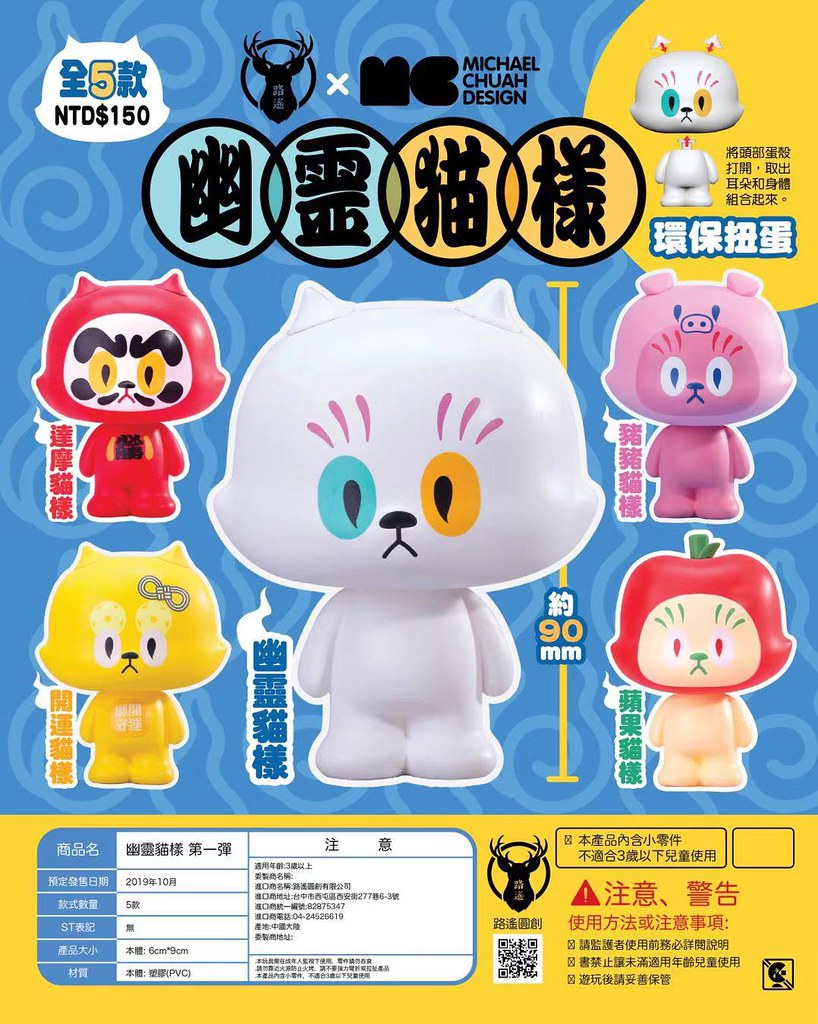 Michael Chuah 專注於漫畫圖像內容的發展、設計多年,身為設計師的他平常也很愛買玩具,在一次看著自己心愛的玩具櫃時,突然有個想法:「有沒有可能,別人也有一個他很喜歡的玩具櫃,裡面有我做的玩具。」於是他決定以轉蛋的形式來製作自己的玩具!「幽靈貓樣」是Michael 在2018年所創作出來的角色,是一隻變成幽靈的貓先生,他有一位青蛙夥伴,這一貓一蛙不斷遊走於人間,常常遇見來自東、西方的各種妖怪,貓先生都會與他們做朋友。