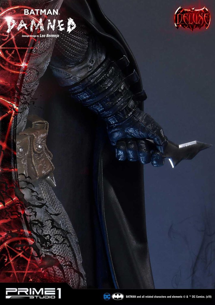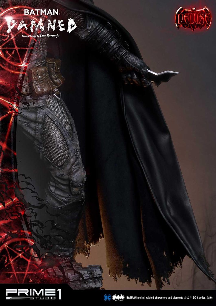 「蝙蝠俠:詛咒 1/3 比例全身雕像」高約76 公分,以精湛的工藝高度重現了原畫裡豐沛的細節,蝙蝠面罩、披風、蝙蝠戰衣、腰帶......情報量相當驚人!有著遍佈全身的大量舊化與戰損,各式各樣被利器割破的痕跡、彈孔,十分精彩!頭雕有一般與左邊臉頰嚴重受傷、左眼變紅的戰損版,左手可呈現出持握蝙蝠飛鏢、鉤爪槍兩種造型,另外,披風也能取下,變化性再提升。