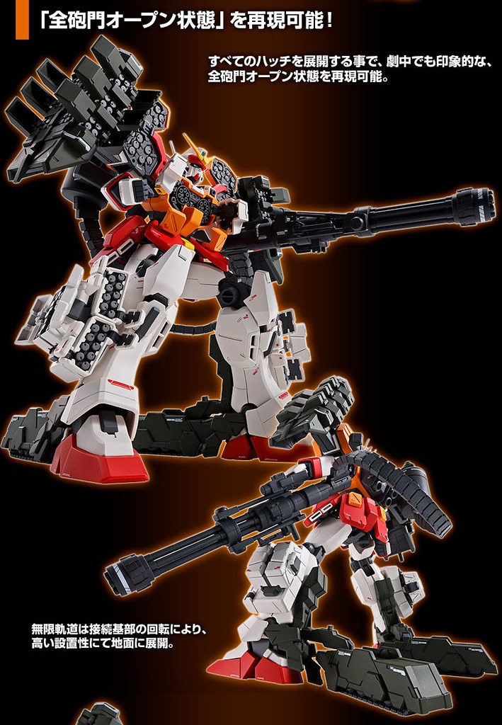 「MG 1/100 重武裝鋼彈EW(刺蝟裝備)」本體套件沿用過去推出的 MG 重武裝鋼彈EW,並追加完全新規的刺蝟裝備與 Katoki Hajime 設計的水貼紙,雙肩大型飛彈艙、腿部飛彈艙及履帶都以 MG 規格再現精密細節,履帶基部設有可動軸能展開收納、各飛彈艙門也能開闔展現內部飛彈構造,演出魄力的「全彈發射」場景!
