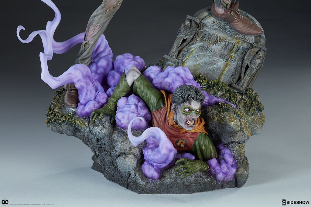 以第二代羅賓「傑森·托特」之墳為題製作的地台有著不輸給稻草人本體的精彩設計,殭屍化的羅賓從裂開的土地裡爬出來,伴隨著大量的紫色煙霧,彷彿呈現出蝙蝠俠在吸入恐懼毒氣之後所看到的景象,羅賓死白的臉龐、開始腐爛的嘴唇都讓人毛骨悚然啊!在EX版中還追加了一款造型更加猙獰的頭雕可以替換喔。