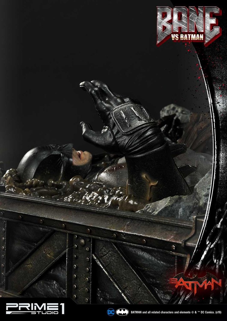 地台木箱、木板、酒瓶......的殘骸在在顯示出這場戰鬥的激烈程度,而滿身傷痕的蝙蝠俠倒在泥濘之中,虛弱地抬起右手,彷彿連起身再戰的力氣都失去了,散發出騎士隕落的黑暗氛圍!EX版中還追加了一顆面具被扯破、流出鮮血的頭雕可以替換,讓這尊雕像的張力再提升!