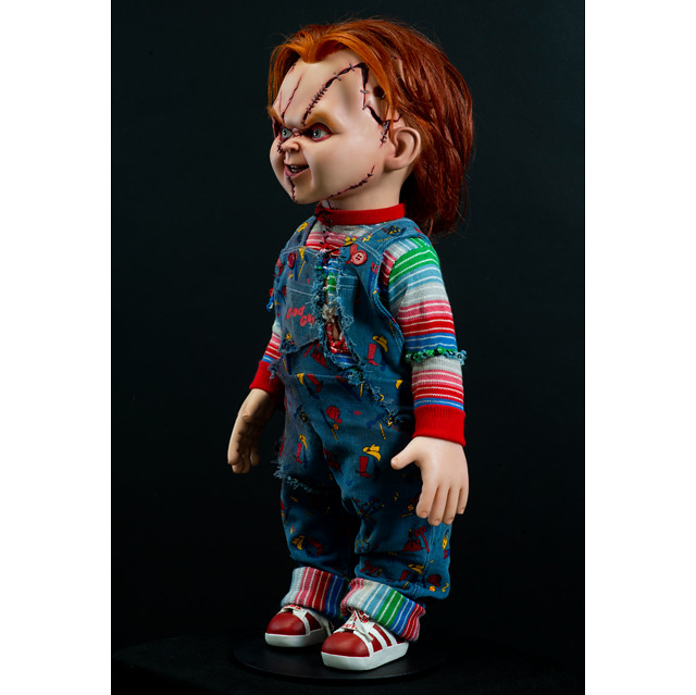 《鬼娃新娘之鬼娃也有種》是恰吉系列的第五部電影,除了殺人魔恰吉、新娘蒂芬妮之外,還多了一位兩人的結晶「葛倫」,三人夢幻胡鬧共演出許多有趣的橋段!這次的「恰吉 1:1 比例玩偶」高約30吋(約76.2 公分),主打從頭到腳的各處細節都精準還原電影道具設定,恰吉的本體採用具備彈性的泡棉打造,內藏的鋁骨架擁有高強度與穩定性,可以擺出多種姿態!