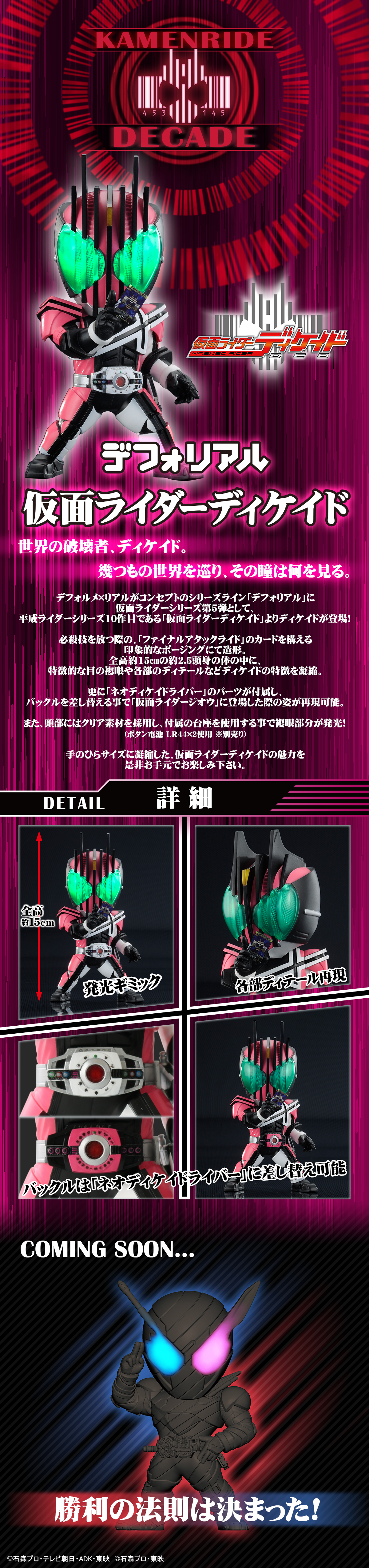 由日本 X-PLUS 公司(株式会社エクスプラス)發行,將精緻真實細節融入可愛 Q 版比例的人氣模型商品 DefoReal(デフォリアルシリーズ)系列繼空我、W、ZI-O、Faiz後,今(08)日再度發表了出自《假面騎士Decade》的最新商品「Deforeal 假面騎士Decade」預計於 2019 年 11 月發售的消息。
