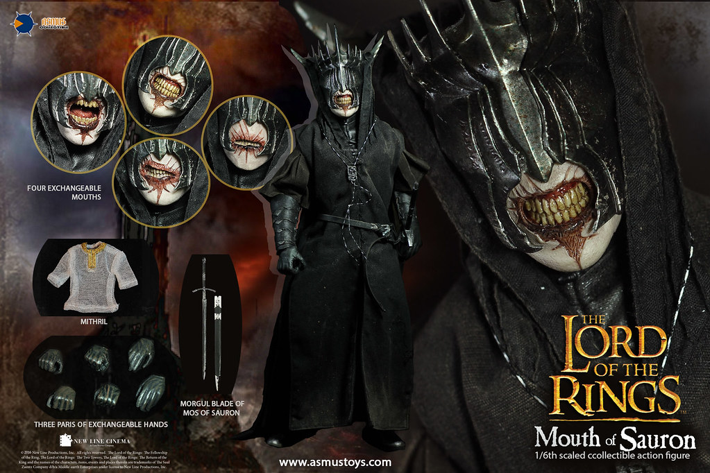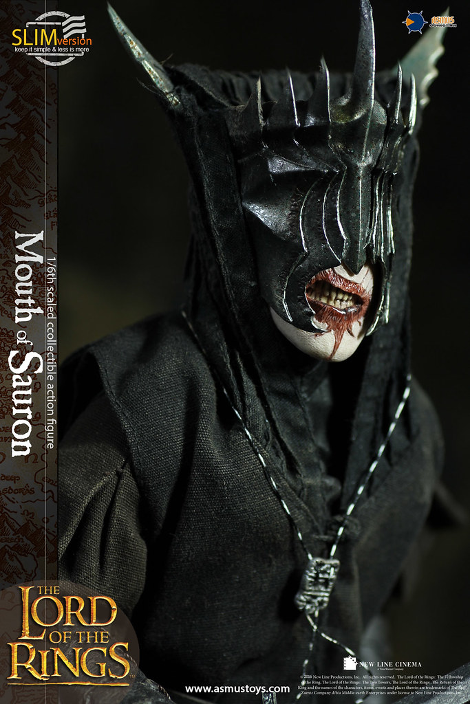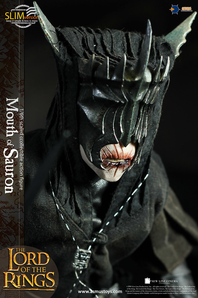 Asmus 曾經推出過「索倫之口&戰馬」的套裝組,這次則是應許多收藏家的熱烈要求,再次推出只有單人的輕量版本(Slim Version),「索倫之口 1/6 比例人偶」高約35 公分,全身共計36 處可動,考究地再現了電影設定,製作出造型搶眼、施以逼真舊化的黑色頭盔,以及佈滿傷痕甚至發黑的巨大嘴巴與有著黃垢的牙齒,本作共有四種嘴形可以替換,配件部分包含秘銀、佩劍,以及多個替換手型,加上以布料、仿皮革材質所打造的整套黑色服飾,絕對是魔戒迷不可錯過的一款精彩人偶。