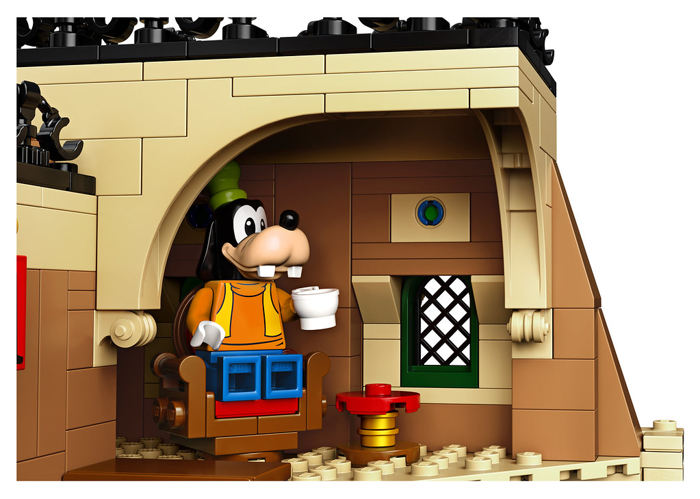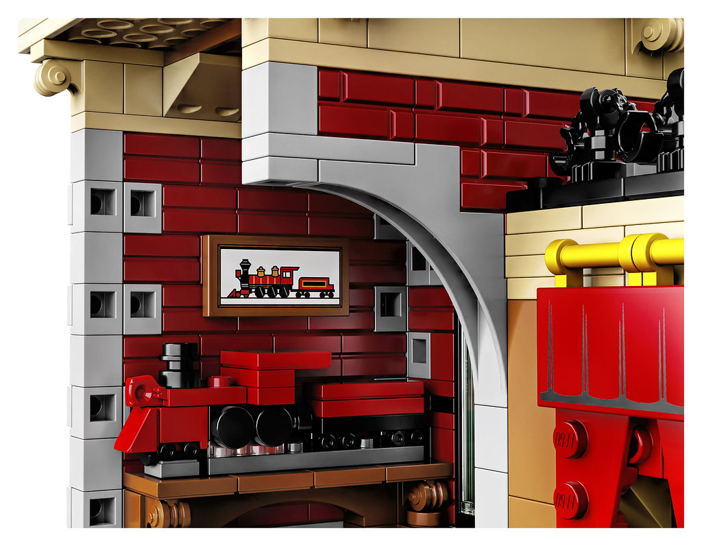 再來是火車站,整體與迪士尼城堡一樣是採用娃娃屋的堆砌形式,建築的正面再現了復古的磚瓦造型、塔樓外觀與漂亮的窗戶結構,磚的顏色選用比真實建築的色彩更加飽和,更具童話感!加上大時鐘、陽台、樓頂的裝飾、米奇頭像與迪士尼的旗幟,整個超・夢・幻!翻轉過來之後就能盡情賞玩票務櫃檯、休息室、塔樓房間、小火車模型擺飾......等精美的內裝啦~