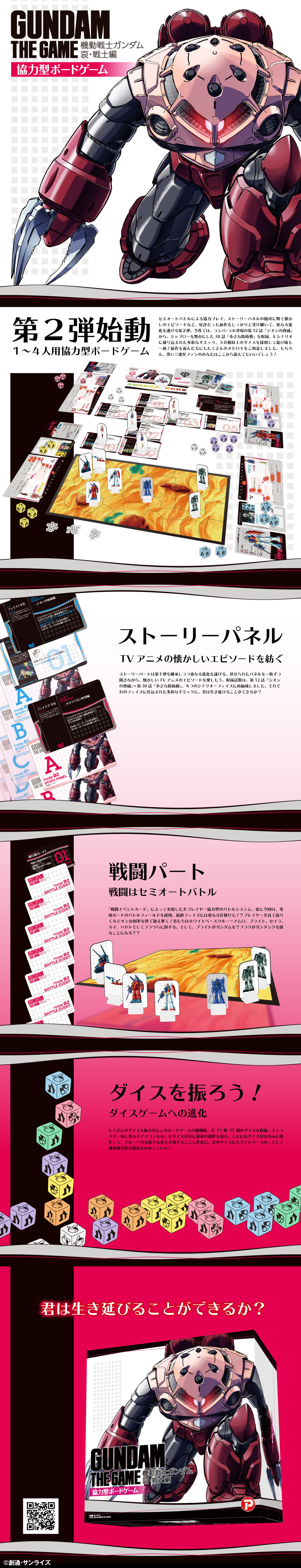 由日本 PLEX 公司(株式会社プレックス)發行,以《機動戰士鋼彈》為主題的全新桌上遊戲『GUNDAM THE GAME』繼第一彈「鋼彈矗立於大地之上」後,日前再度發表了第二彈「哀・戰士編」預計於 2019 年 11 月發售的消息。