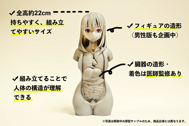 『美人體模型』目前預計推出男性、女性兩種造型,高度約在 22 公分上下,攜帶、組裝都相當方便,且邀請到曾參與漫畫《哆啦A夢身體系列》指導的日本解剖學教授 坂井建雄 進行監修,每個人體器官的色彩皆相當還原,且多數都能拆卸下來,在組裝的過程中也讓大眾更加了解人體內部的器官結構。