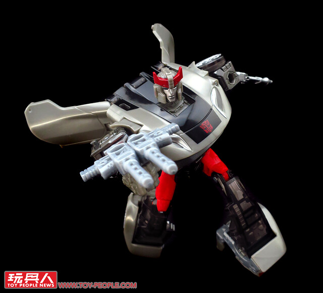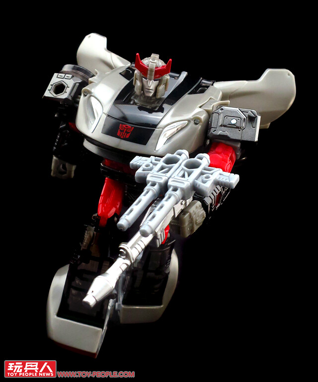 ▼ WFC-S64「藍紋」(Bluestreak),博派(Autobots)的射擊高手,喋喋不休的嘮叨鬼,在G1中與巡弋(Prowl)、煙幕(Smokescreen)同樣掃瞄了達特森(Datsun)的280ZX作為載具擬態,本次的圍城版本乃是依循這個經典設定,將同系列的第23號「巡弋」重塗、並附錄新的雙重肩砲W-50「電壓束加農砲」(Volt-Beam Cannons)而生。