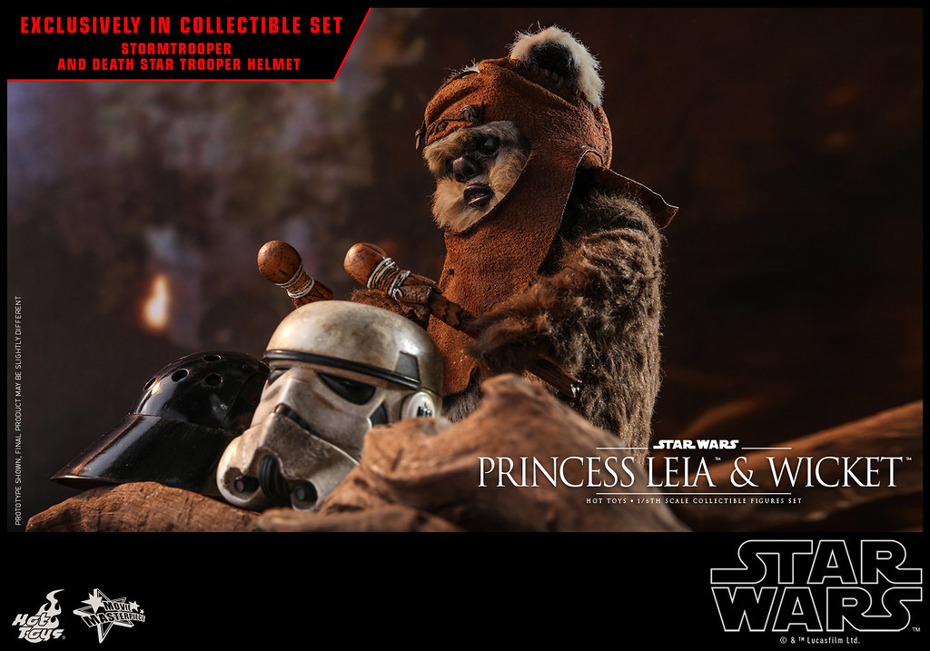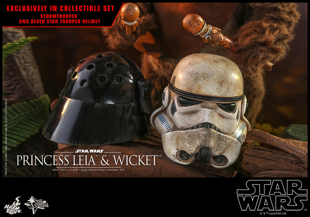 本次的套組除了包含MMS549 莉亞公主與MMS550 伊娃族Wicket 的所有內容之外,還多附上了施以寫實舊化效果的1/6 比例帝國風暴兵頭盔、死星士兵(Death Star Trooper) 頭盔可以讓Wicket 敲敲打打!可是只附兩個頭盔實在太少啦~起碼要各兩個然後再加一款帝國偵察兵的頭盔才能還原電影場景呀!XDDDD