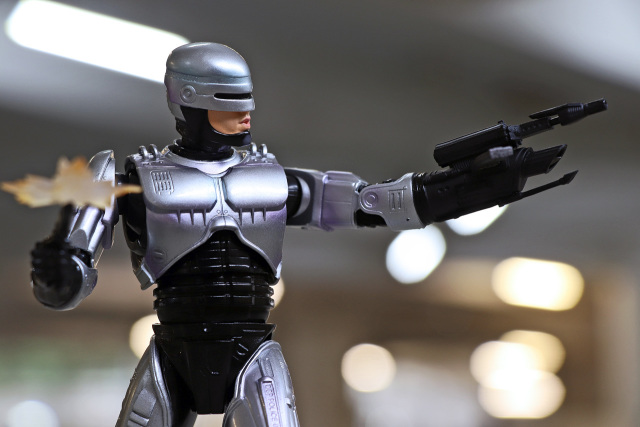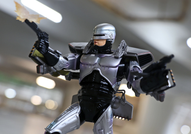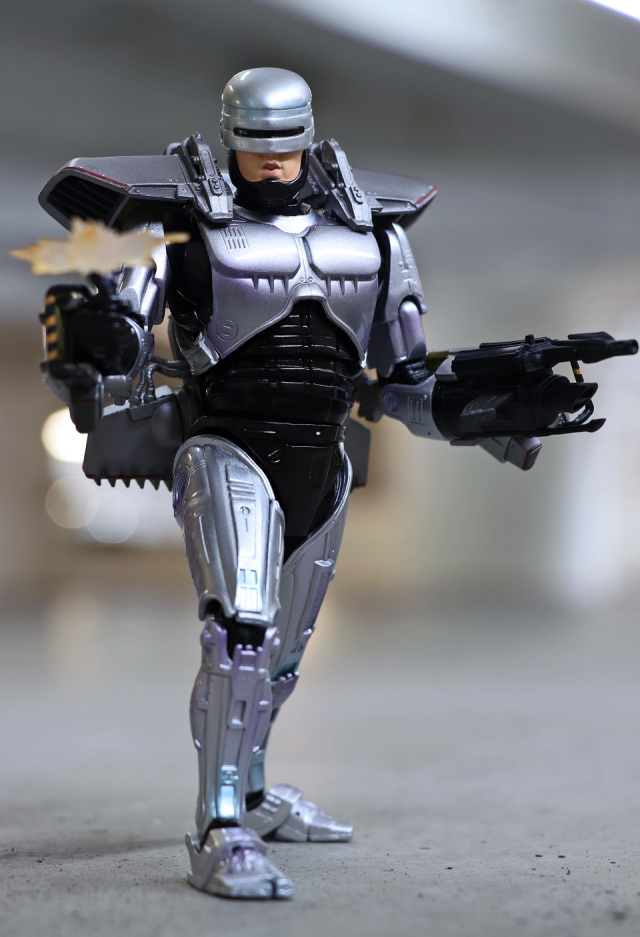 QC 不俗。可動性方面以 Robocop 的外型設計來說算是不俗了,但外甲防礙關節活動的情況時有發主,玩的時候注意一下。主體以金屬淺藍和黑鐵色為主,塗裝不俗。心口配件內藏磁鐵,故更換為飛行背包模式亦十分方便。關節鬆緊度以 MAFEX 的產品來說是非常好,放心玩吧!而最讚的是背包前臂甲的可動設計,它已經將防礙減到最小的了!