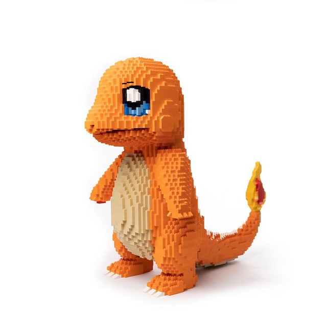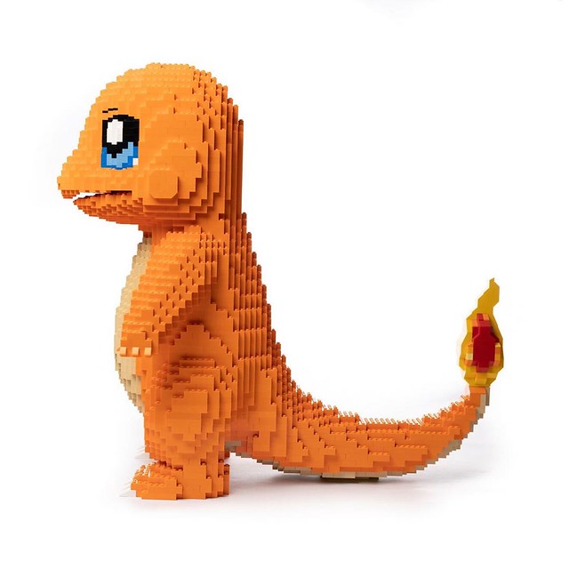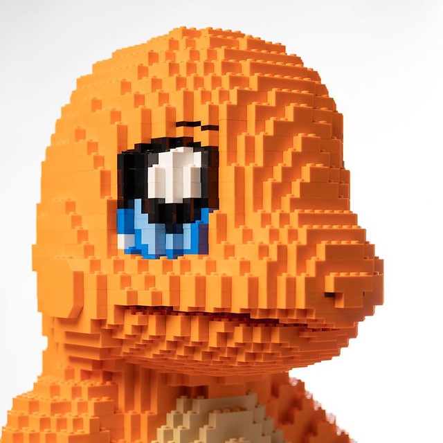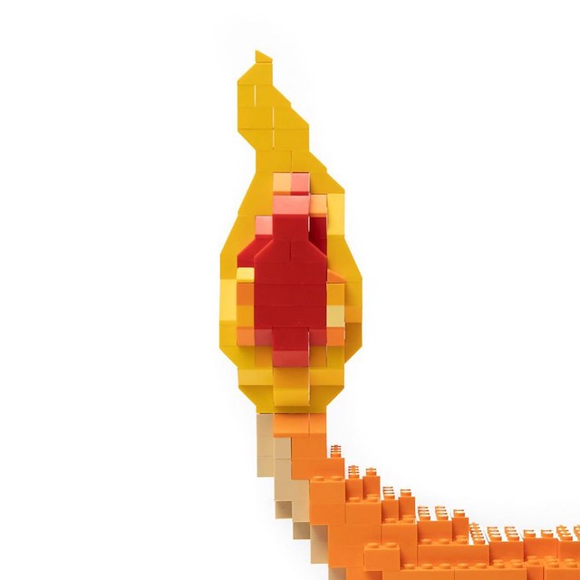 一顆一顆四四方方的積木在Dave 的堆砌下細緻地勾勒出小火龍頭、肚子、尾巴等部位的圓弧線條,水汪汪的大眼睛更是用上深淺不一的藍色磚表現出層次感,微微張開的嘴巴也還原了,尾巴的火焰造型十分出色,採用豐富的斜面磚、並注入由黃至紅的多種色彩來形塑,展現出火焰的流動感與漸層感,光是火焰的結構就讓小編欣賞、研究許久,而小火龍整體更是越看越療癒呀!