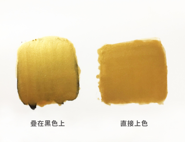 在上金屬色前先上一層黑色! 黑色可以幫助金屬色發色,單獨上金屬色的塑膠感比較重,相對疊在黑色上的金色比較有深度,質感也比較好(*ˇ∀ˇ*人)