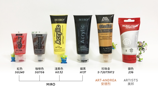 使用的壓克力顏料分別是MIRO、ART-ANDREA 安德烈和ARTISTS 美邦,在美術社可以買到。
