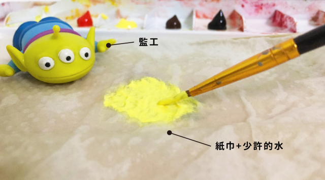 在調色盤上我們可以先鋪一層廚房紙巾(或是擦手紙巾),倒一些水讓它浸濕,大概蓋過紙巾高度,再視情況慢慢加。