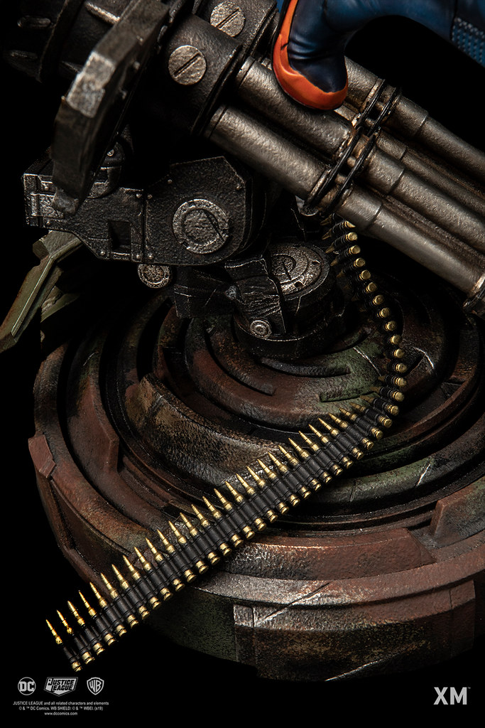 「DC Rebirth 喪鐘」尺寸為長38 × 寬36 × 高39 公分,展現出躍動的戰鬥姿態,前傾的上半身、飛舞的綁帶使本作更添速度感,並展現出XM Studios 一貫高水準的製作工藝,貼身戰衣上的顆粒、格紋、皺褶十分精美,精湛的手工上色表現出緊身衣、皮革槍刀套的異樣質地,位於左前臂的橘色護甲還施以寫實的舊化戰損,附屬拿槍、反手持刀兩種替換左手零件,地台則是以極具金屬厚重感的大型機關槍為題製作,仔細一瞧,除了彈孔外,兩側還呈現出被俐落刀勢給一刀兩段的瞬間?!