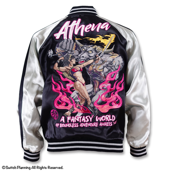 雅典娜款式的圖案,主要參考自當時 SNK 在街機上所推出的同名動作遊戲,雅典娜的造型是手持劍與盾牌,身穿性感的三點式泳裝。原本遊戲裡的造型是走可愛風的,這件刺繡外套背面的圖案,則是把雅典娜塑造成猶如女武神般,描繪出她與敵人作戰的健美英勇型態。正面的左胸部位,則是刺上一把帶有粉色劍器的劍,外套採銀色與黑色做為基底,整體感覺非常酷。