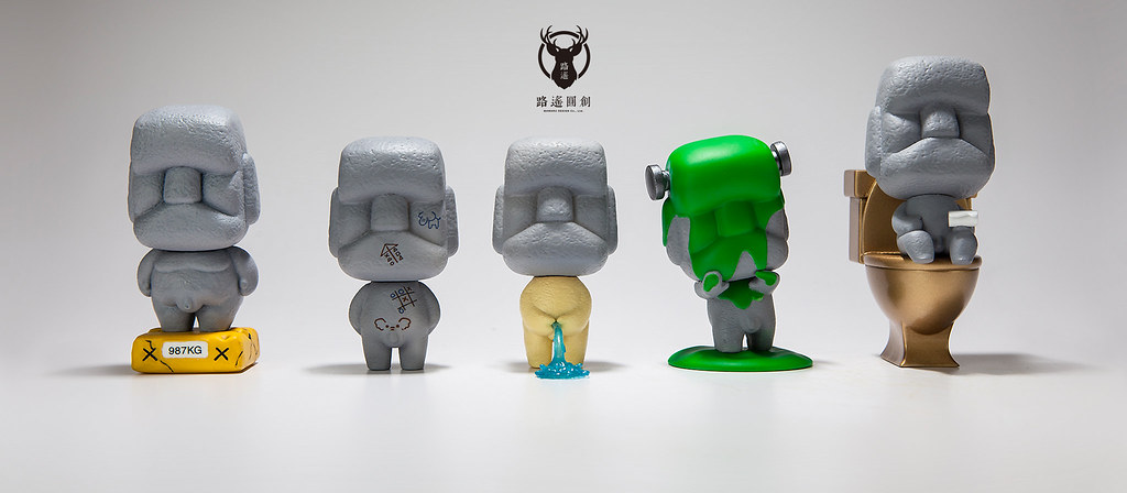 第三款(圖 C)是以摩艾量體重的樣式呈現,在復活島生活的摩艾是非常注重體態的,體重機果然呈現出驚人的天文數字,第四款(圖 D)像是萬聖怪人的裝扮,身體染上綠色塗料,對比強烈的配色讓這款摩艾極為吸睛!第五款(圖 E)則是摩艾正在上廁所的坐姿造型,可搭配討論度極高的第六款(圖 F)金色馬桶一起把玩,重點是馬桶裡面還有黃金!?實在是太爆笑啦~!
